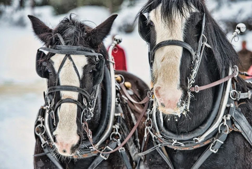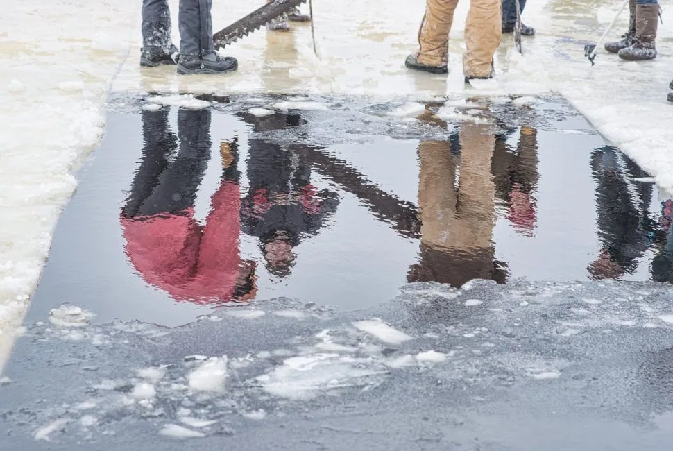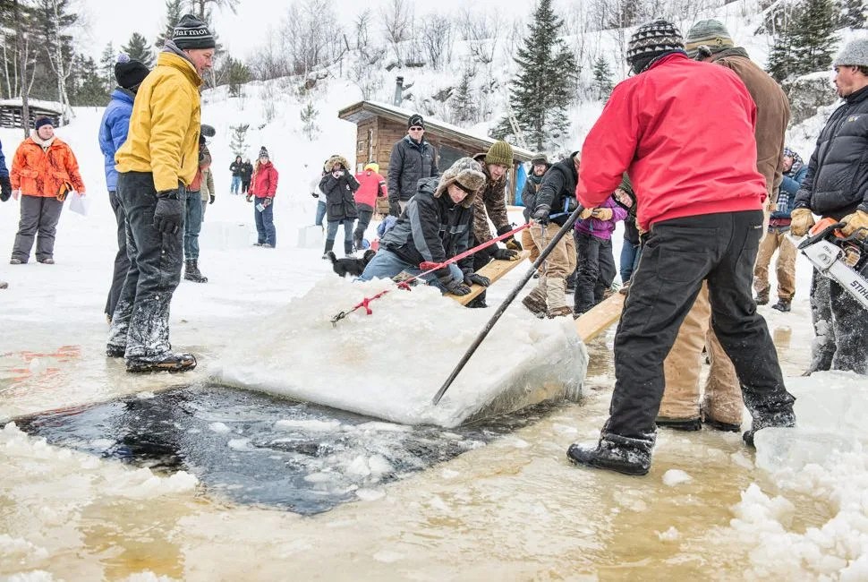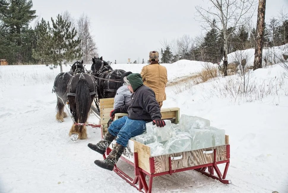 “Pull!” With a shout from one of the ice cutters, the tug-of-war began. At one end of the rope, a dozen bodies heaved, their boots scrabbling for grip on the slushy surface. At the other end, an ice cube the size of a sofa was a formidable foe. Amidst cries of encouragement and more grunting and straining, the 400-pound ice block reluctantly started to bob in the water. Two men hurried to wedge a pair of wooden boards under it to create a ramp. The sheer willpower of the mob won out finally as the ice slid up and onto the frozen lake surface. Their load suddenly easier, the winning team ran along, chased by the slithering block which was held fast by an ice screw. A cheer went up as the two-foot-thick block, as clear as a diamond, came to a stop. Four huge draft horses, steaming in the cold, looked on indifferently. One snuffled and shook its head as if to say, “Child’s play.”