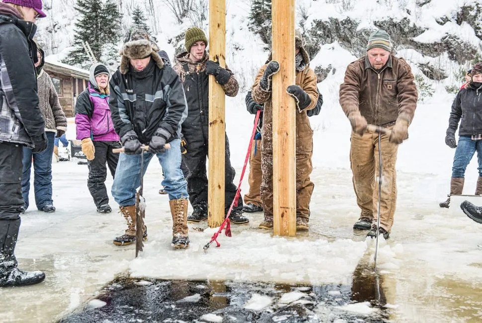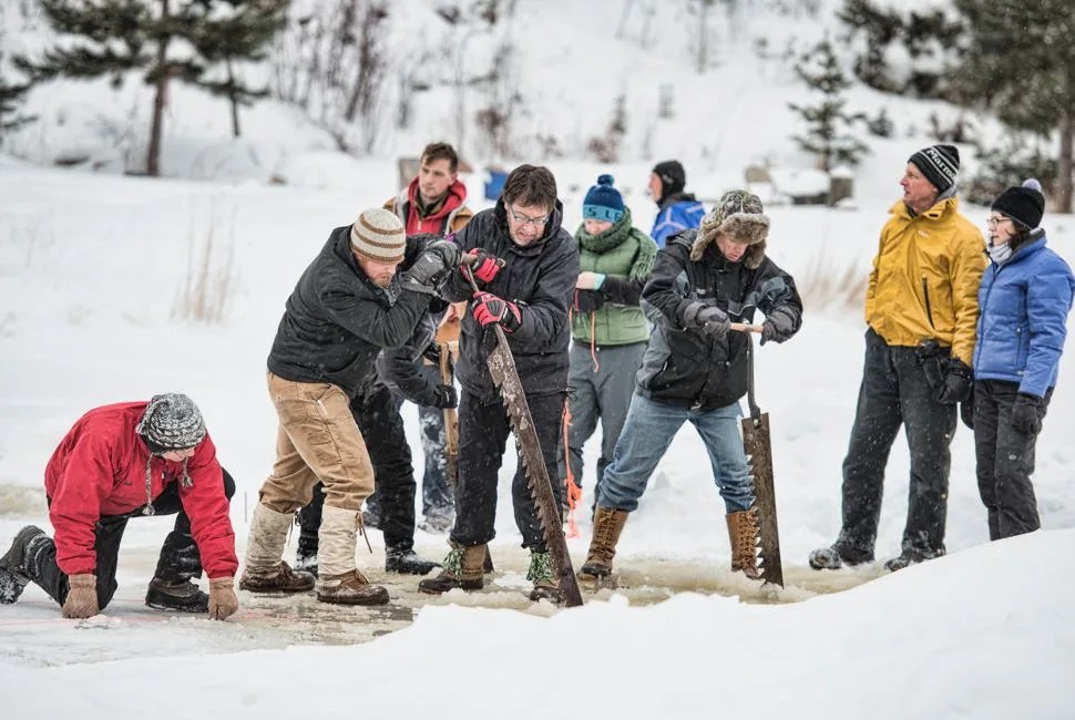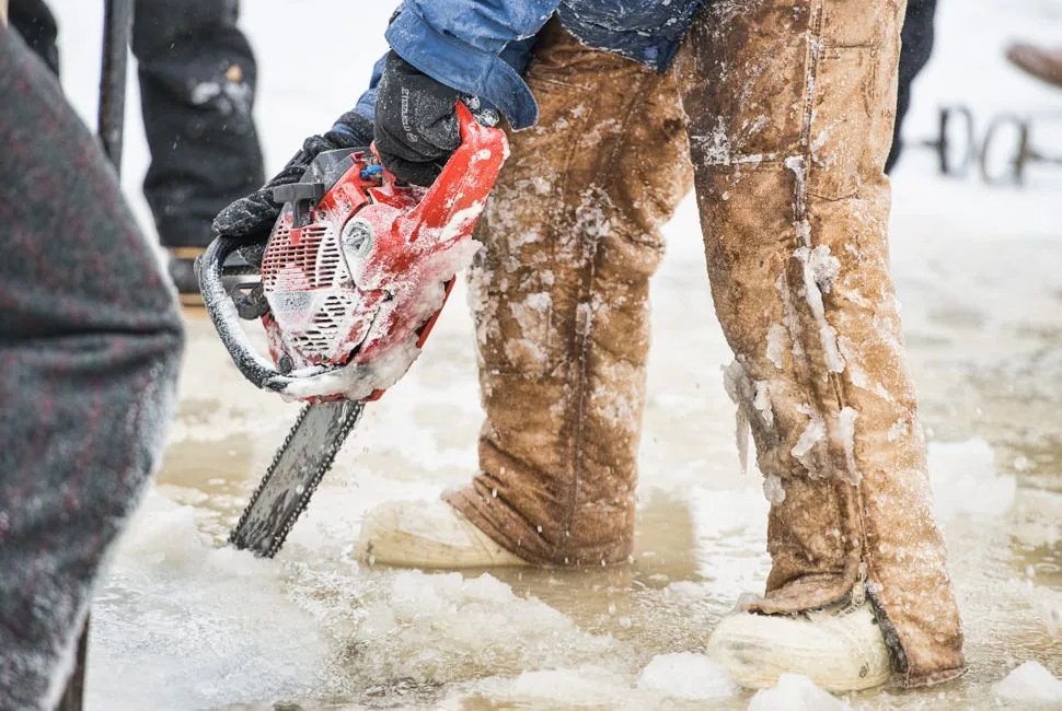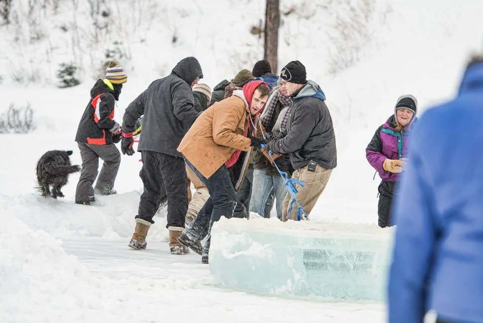 Last year’s relatively mild winter made for perfect conditions. At a “mere” two feet thick, the ice released fairly easily from the lake, where it had been forming since November. The day of the Ice Ball dawned cloudy and a tolerable five degrees Fahrenheit with little wind. Volunteers took up their stations, people of all ages and sizes: college students from Minneapolis, old locals and some of Steger’s expedition buddies were all in the mix. Complainers were not allowed.