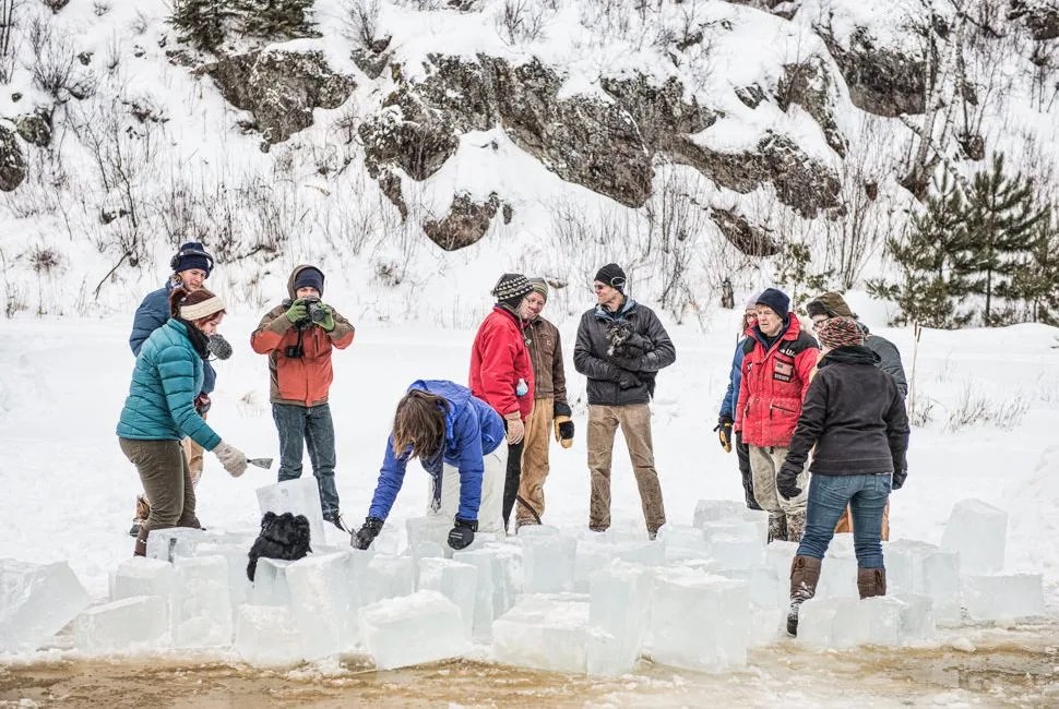 After a full day of hard work in cold, wet conditions, someone stoked the wood stove in the lodge, a keg of beer and a pot of chili materialized and a local crooner picked up a guitar. People took turns walking to the sauna for a good sweat and scrub followed by an icy plunge into the fresh hole in the lake. The party went into the wee hours until the last of the crowd filtered out to go bed down in sleeping bags in the wood shop next door, exhausted but happy.