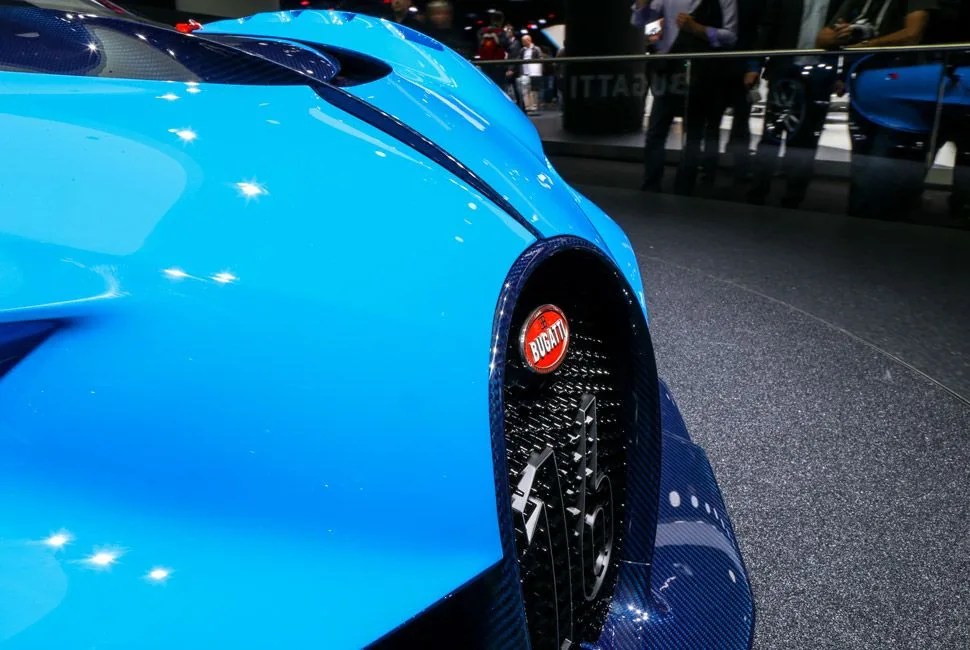 A. So we only had two rules that we had to follow. First, come up with a teaser for things to come from Bugatti. And we’re only a couple of months away from showing the next Bugatti, publicly, officially. Second, illustrate the concept in a way that it can not be mistaken — like an intention to go racing. Then we created the car and its performance aspects. Some of the styling and design DNA, like on the rear end, is something you’ll see on the future production car — the cut-away rear end with a very horizontal accentuation of the tail light. Also, the massive center fin. And together with the center fin and the fins on the fender, is something we draw on a little from the past, if you remember the Bugatti Atlantic 57 SC. Then here on the side, is probably the most important element, the “Bugatti line.” It often gets mistaken for a purely aesthetic line. Yes, it was influenced by Bugatti’s signature. Yes, it was on the Bugatti Royale Type 41 — and it was very much a stylistic theme at the time. Here it becomes a performance theme. This line is all about air-intake performance. From the A-pillar down to the door sill, it is all air-intake. And the future Bugatti product will have those elements. And lastly, on either side of the iconic horseshoe grill, the eight-eye face. It’s what you’ll see when any future Bugatti is coming toward you or is in your rearview mirror.
