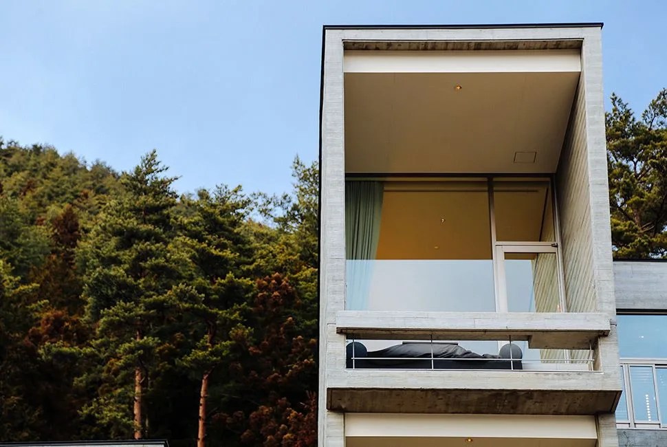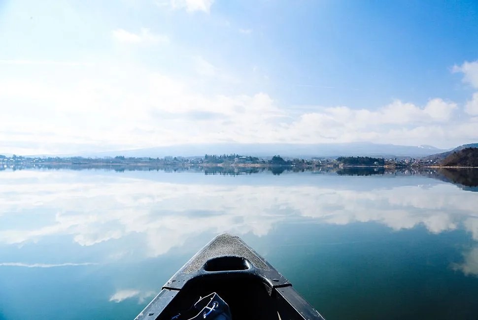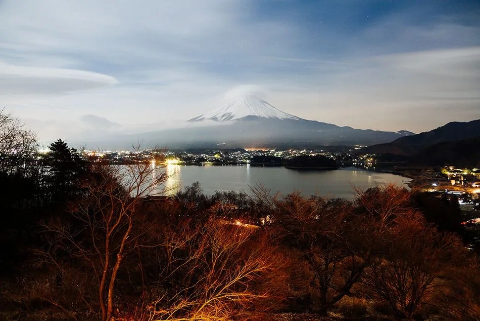 During the day Hoshinoya Fuji looks like uneven stacks of concrete blocks with glass covering the negative space. When the sun goes down and the lights in the rooms go on, the sky, a deep royal blue, contrasts with the rooms, now illuminated by soft yellow light and small gas campfires flickering on the balconies. From inside, floor-to-ceiling glass windows reveal views of Lake Kawaguchi and Mount Fuji, which on clear days is fully visible. On some occasions the mountain’s spectacular 12,389-foot summit is draped in lenticular clouds, which look as if they’ve been painted on carefully with a brush. If you judge a room by its view, this is one of the best in the world.