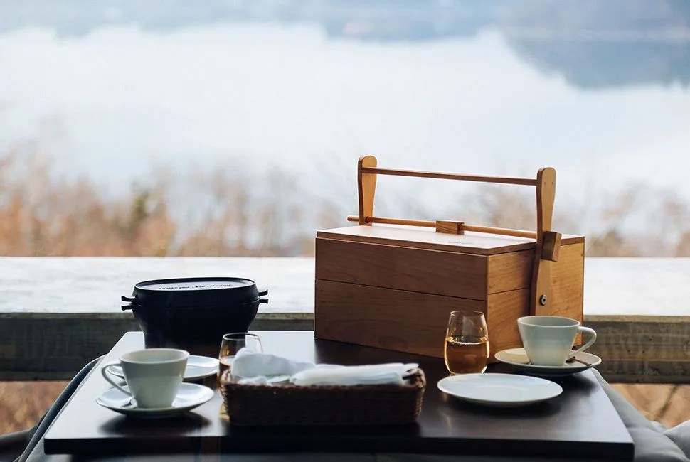 Outside of the rooms the experience more closely resembles glamping. On the balcony there’s a kotatsu, a low wooden table with recessed seats and a heated blanket for your legs — an ideal setting for an opulent in-room breakfast of soft Parker House rolls, local berry jams, ham cooked on a griddle, quiche, and salad decorated with edible flowers. Beyond the rooms, a path through the woods leads guests to a series of wooden decks — called the “cloud terrace” because of their shapes — complete with low-slung chairs for relaxing, a campfire, pastries in the afternoon, tables for private dining in the evening, and a bar that opens at night, stocked with good bottles of Japanese whisky from Yamazaki, Yoichi and Miyagikyo.