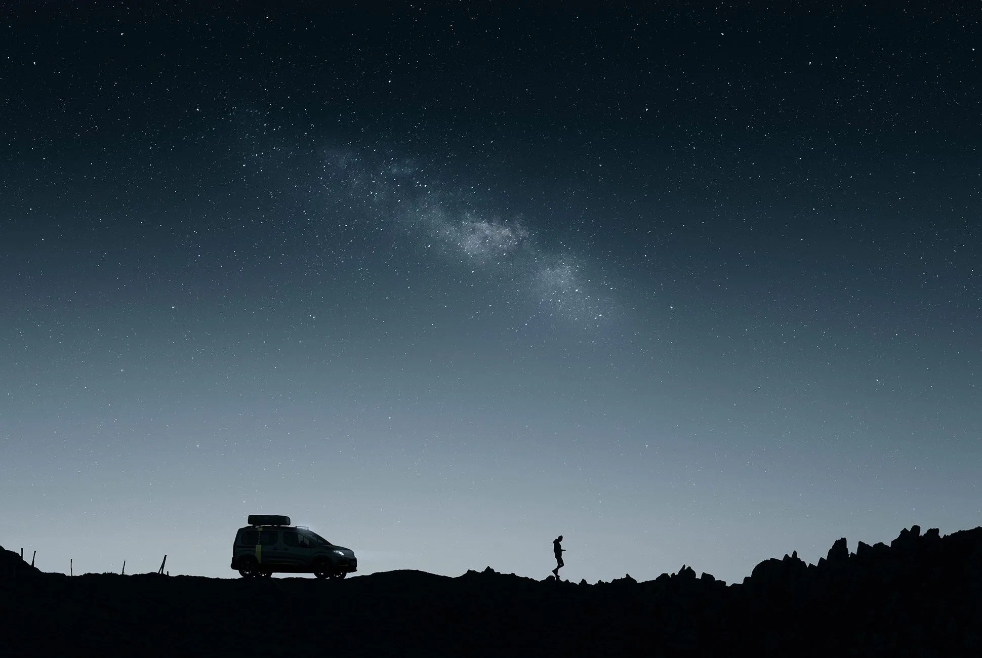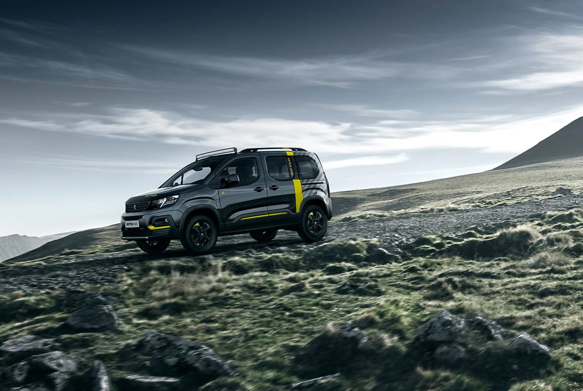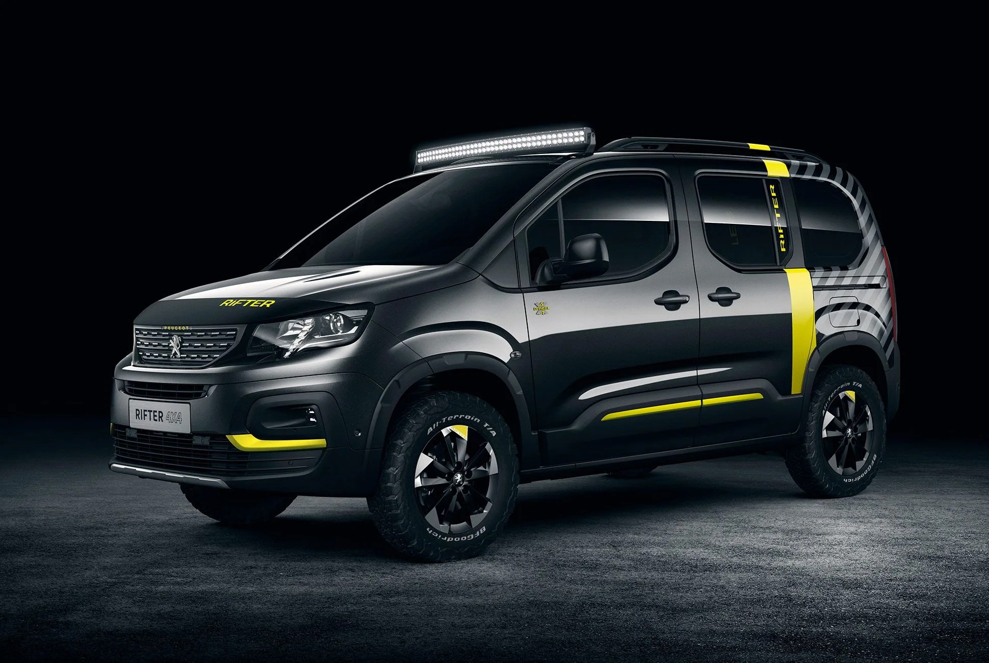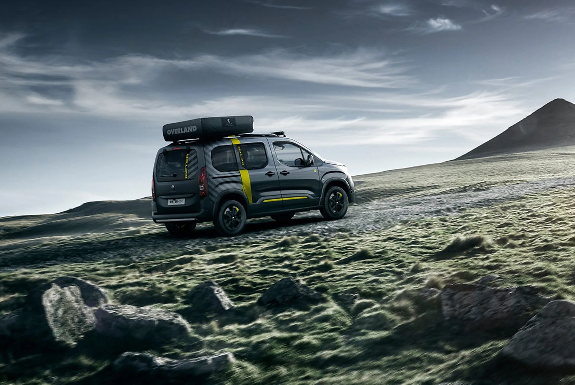 The Rifter 4×4 shares a common PSA platform with Citroen’s Lingo and Vauxhaull Combo Life, and in this instance it’s outfitted to perform, having been kitted with a viscous-coupling 4×4 system, an 80mm lift and rugged tires from BF Goodrich. Peugeot covered the Rifter 4×4 with a killer paint scheme as well: a combination of gray and matte black is shot through with a yellow stripe both inside and outside. Out back is an extra transport option for those who care to venture further once the two-track ends — that’s a Peugeot eM02 FS Powertube electric mountain bike in case you’re curious. An LED light bar is mounted up top, just in front of an Autohome roof tent.