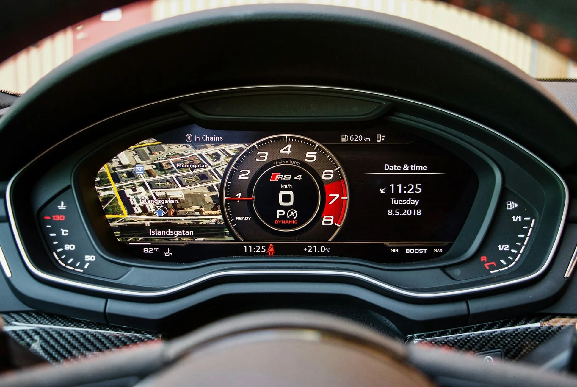 The interior is a tech wonderland too, like most modern Audis have been. A crisp infotainment screen adorns the center of the dash, and the driver is treated to Audi’s excellent Virtual Cockpit display with a little bit of RS flair. One touch of a steering wheel-mounted button, and you can switch from a full-screen map, media, or vehicle info to a central combination speedometer and tachometer. The wood or aluminum that would normally adorn the dashboard was replaced in my test car with sleek carbon fiber, and the honeycomb-stitched bucket seats hug your frame just the right amount for some spirited backroad driving.