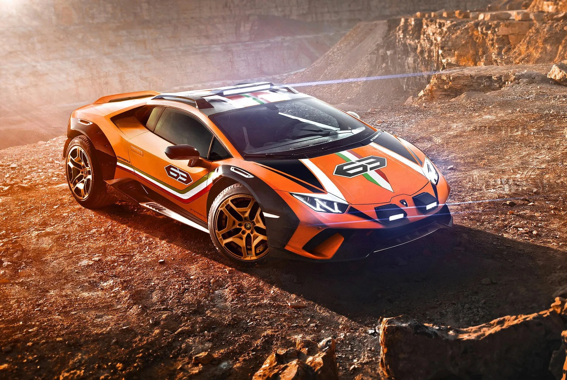 Power is unchanged versus the regular Huracan Evo; there’s still a 5.2-liter V10 cranking out 631 horsepower and sending it to all four wheels via a seven-speed dual clutch gearbox. But the powertrain’s now shielded from harm by aluminum skid plates on the underbelly and stone-deflecting composite bodywork encircling the engine. The air intakes and mud guards are made from a combination of elastomeric resin and carbon fiber, while aluminum-reinforced side skirts add extra armor. A roof-mounted LED light bar and a pair of LED bumper lights throw extra illumination down the trail after the sun goes down.