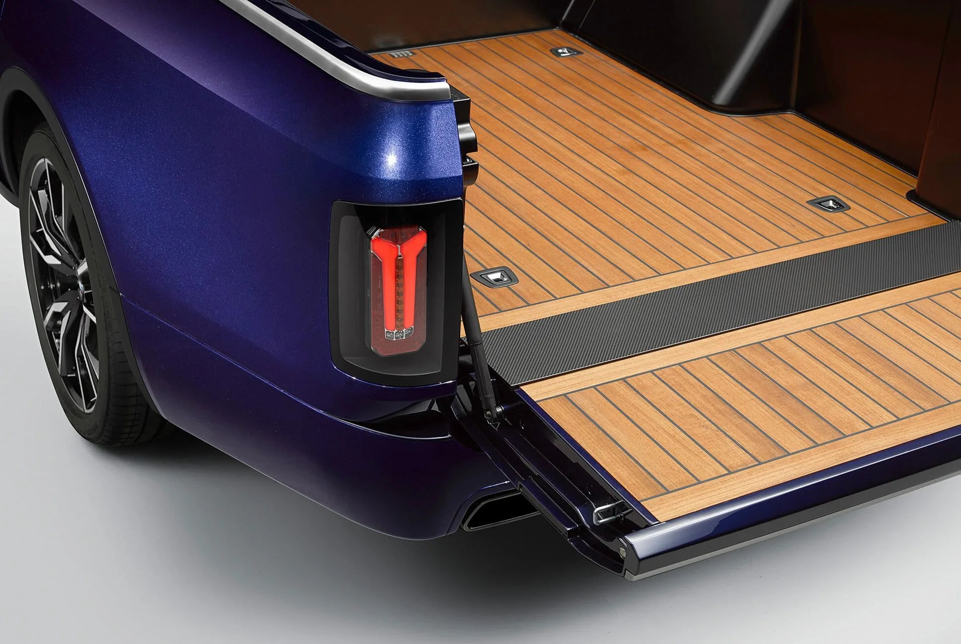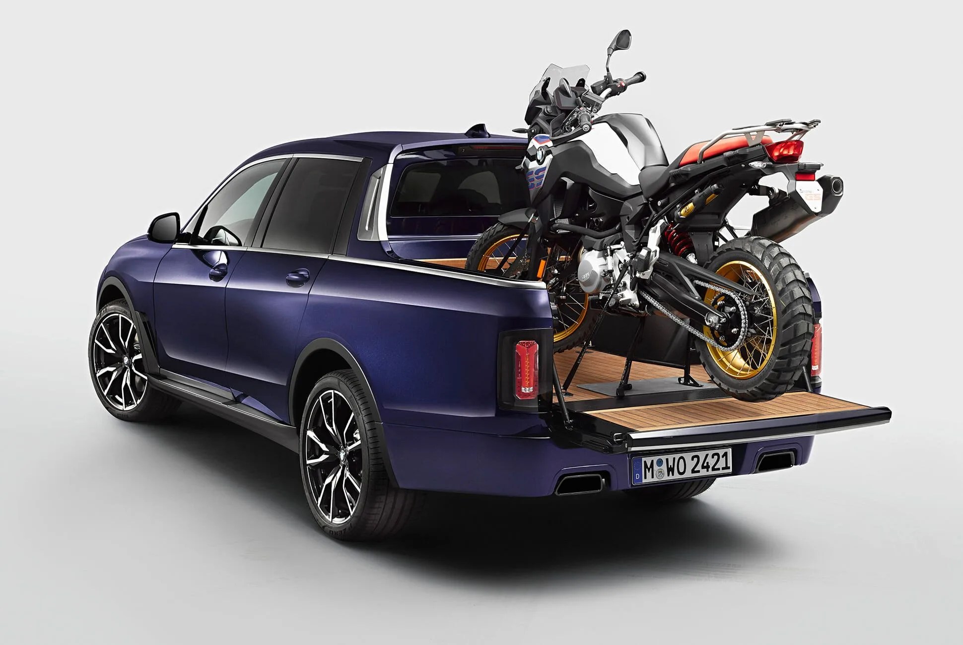 The X7 Pick-up — which came loaded with a BMW F 850 GS in the bed — was put together by the BMW Group’s vocational trainees, along with the help of the company’s Concept Vehicle Construction and Model Technology divisions. The young talent at BMW started this project with a standard X7, the latest and most luxurious crossover vehicle the company makes. The team handcrafted the truck bed using highly polished teak wood slats for a perfect marriage of luxury and durability, and added 3D-printed parapet elements, hand grips and trim strips.