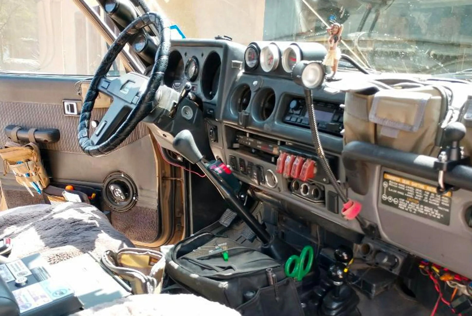 That roof basket also holds six NATO fuel cans to supplement the 40-gallon gas tank, as well as an awning to provide a little shade when stopped. 360-degree flood lamps up there supplement the Hella H4 headlamps and PIAA driving lights mounted up front. Steel bumpers and rock rails provide no-frills protection against errant boulder attacks.