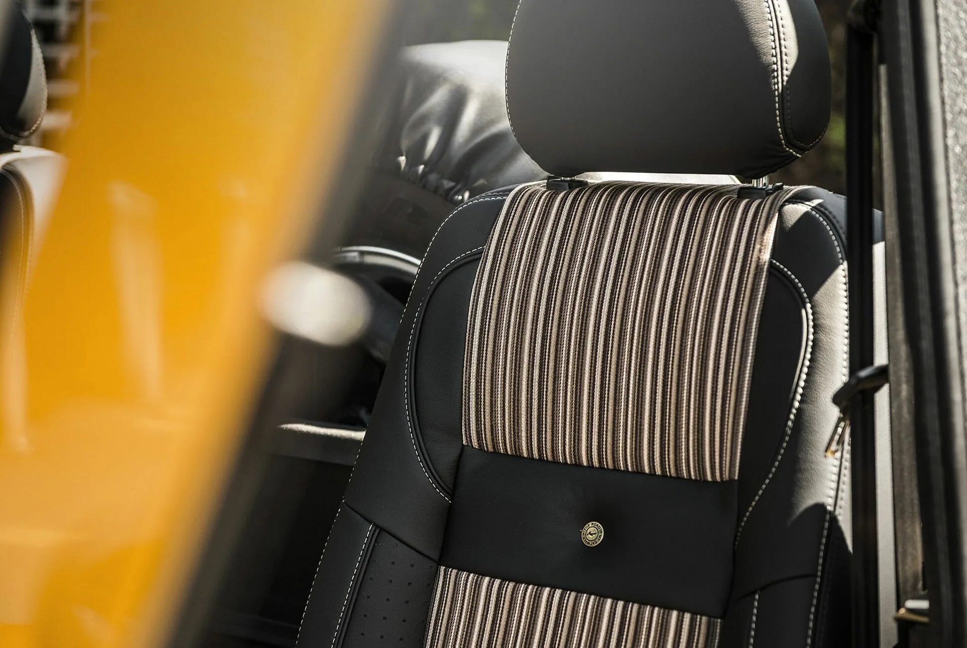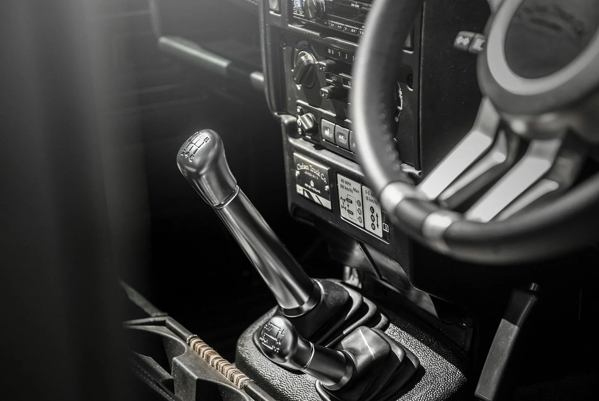 Swing open the square door, however, and you’ll find a stylish interior that looks almost too nice to get muddy. Quilted leather adorns almost everything the eye can see, with earthly lines and patterns breaking up the swaths of black. The steering wheel, shift lever and transfer case are all made from billet steel for a satisfying heft, while modern convenience features like power windows and locks and an Alpine stereo offer up just a dash of convenience.