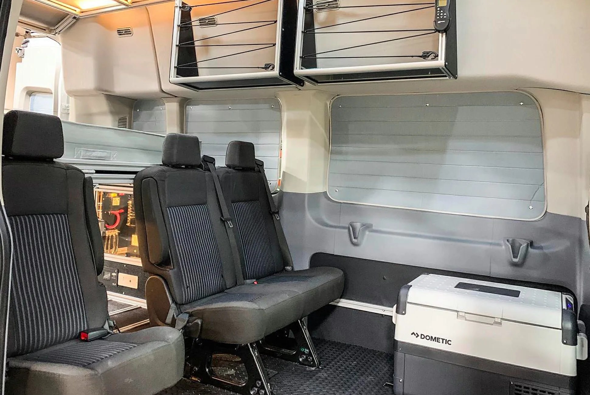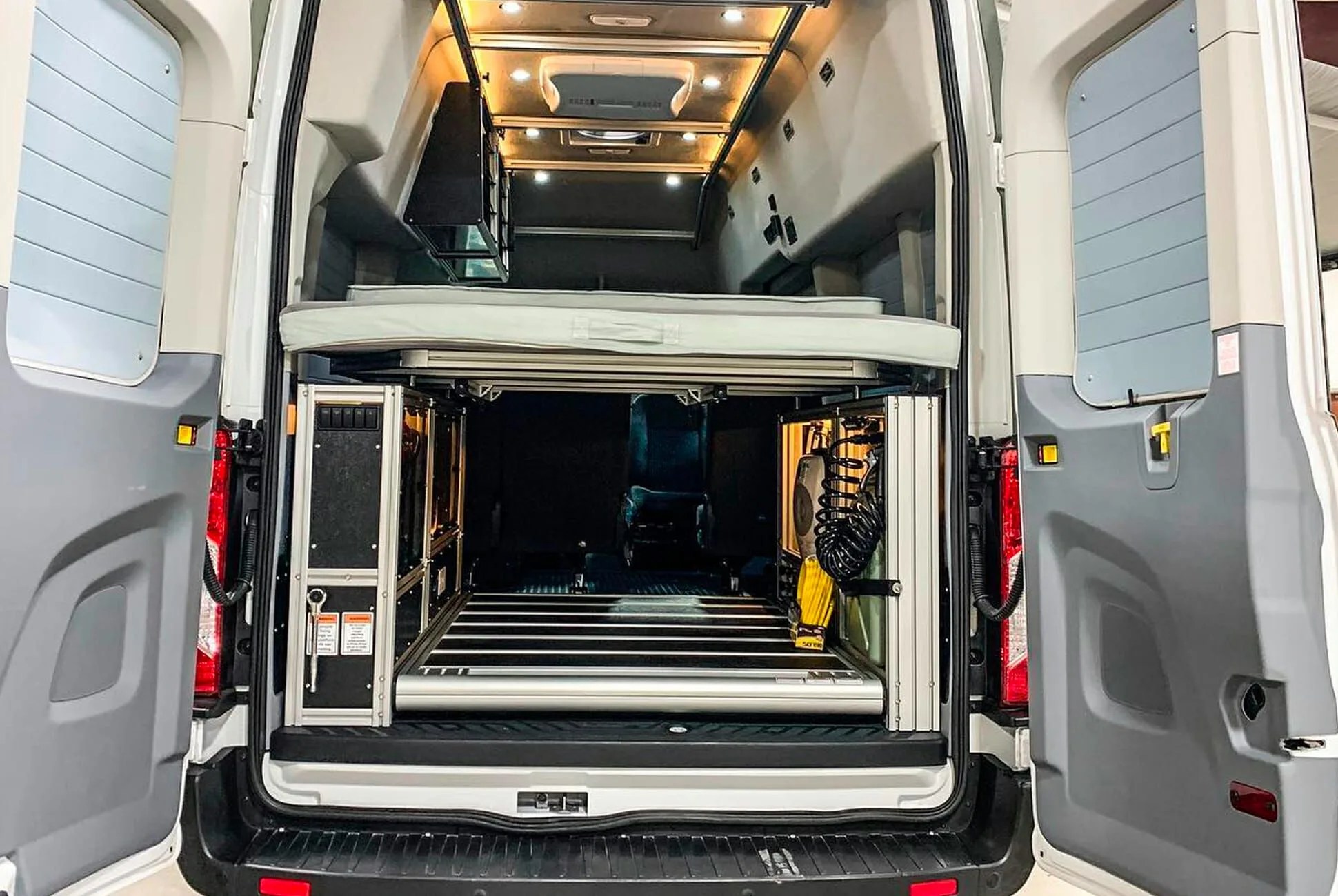 VanDOit’s modular system can offer a wide range of functionality and multipurpose use. The key feature is the bed platform: it’s on a hydraulic lift, allowing it to rise up to carry gear in the cargo area. It can also fold to accommodate a third row of removable seats, raising the potential seating capacity to eight.