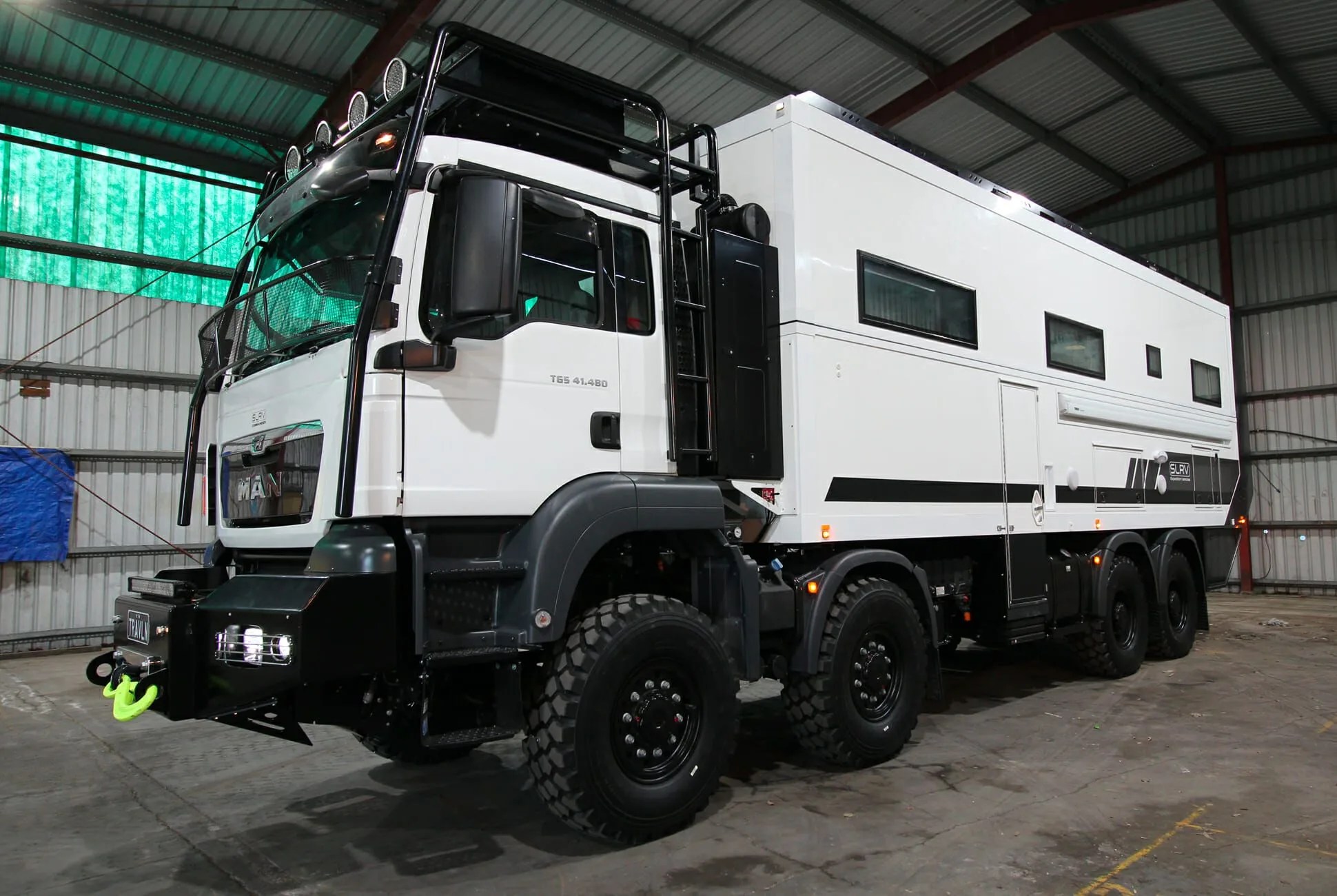 SLRV based the build off an off-road capable Man TGS 8×8 with all-wheel-drive. The engine delivers 480 horsepower and 1,646 lb-ft of torque; its 12-speed transmission can be shifted automatically, or using a manual mode. It also has a two-speed transfer case, four locking differentials and an adjustable air suspension.
