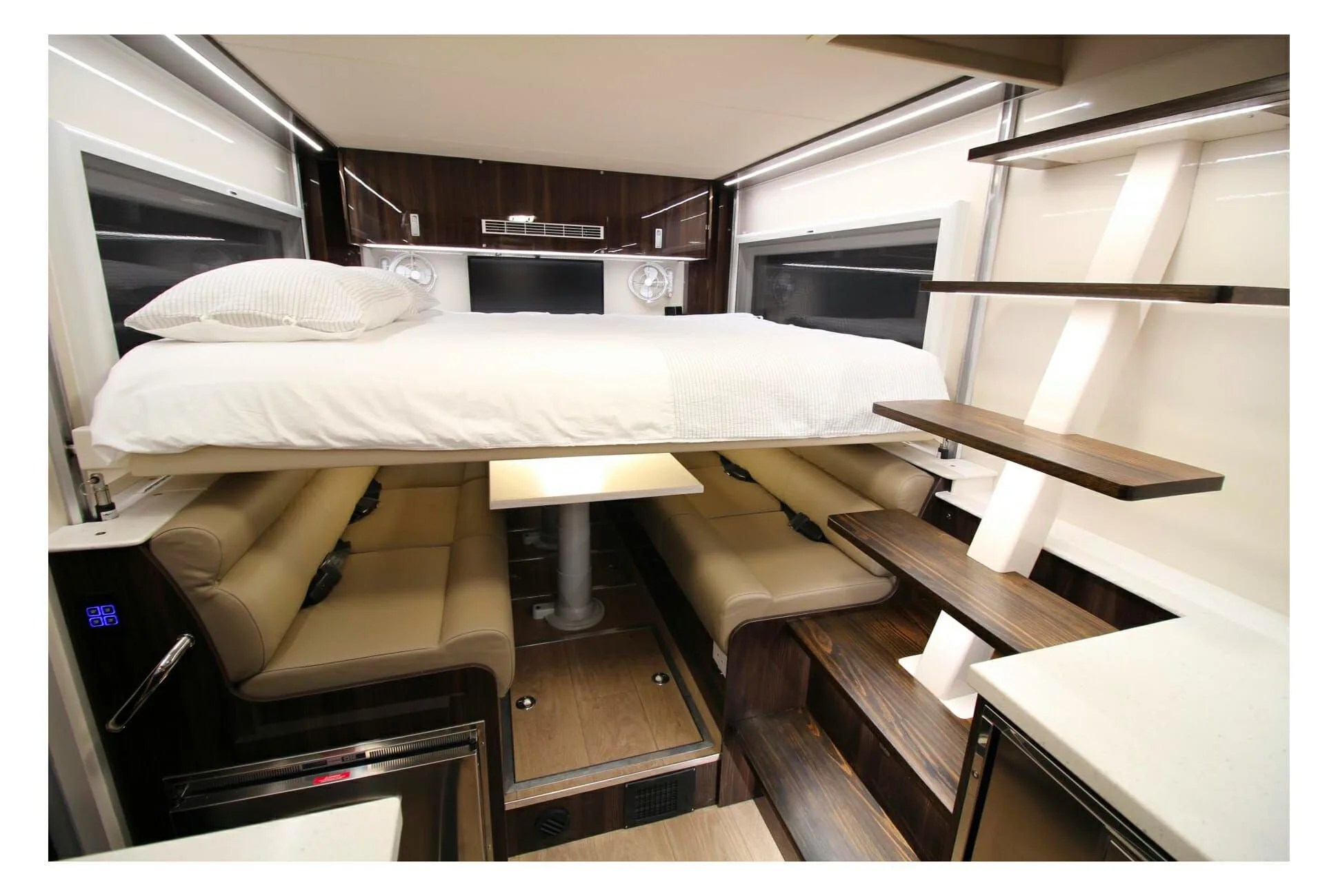 The first floor features a private master bedroom, bathroom, kitchen, and dinette. The roof lifts to create a second story that sleeps six, and offers a pop-up TV. An additional king-size bed can be lowered over the dinette area to provide the full 10-person sleeping capacity.