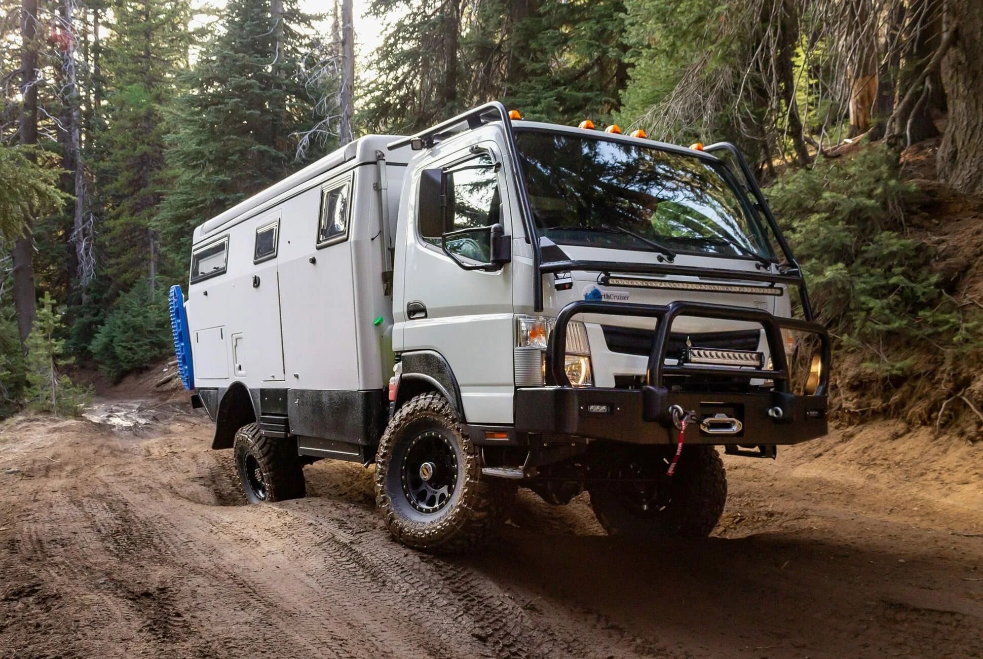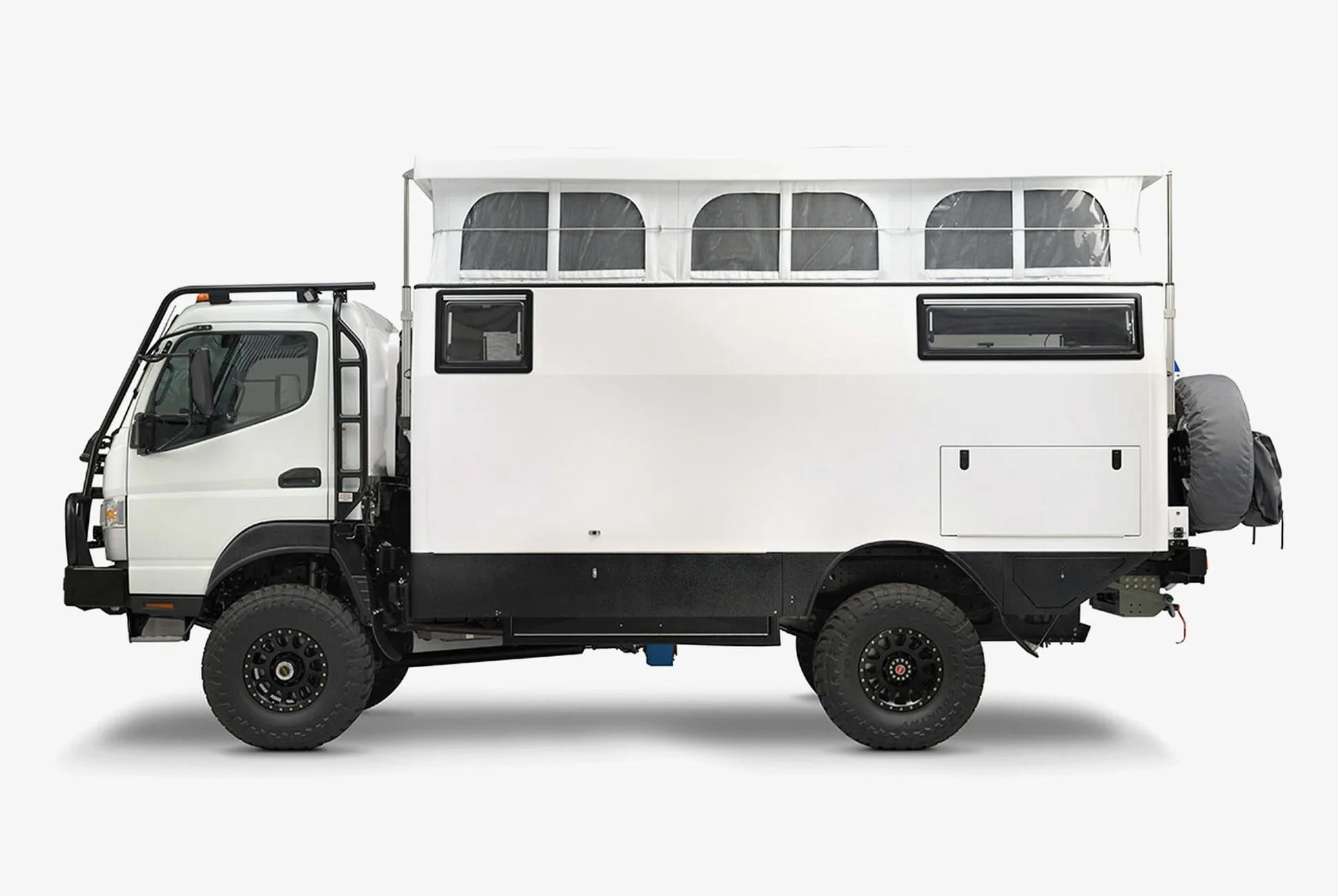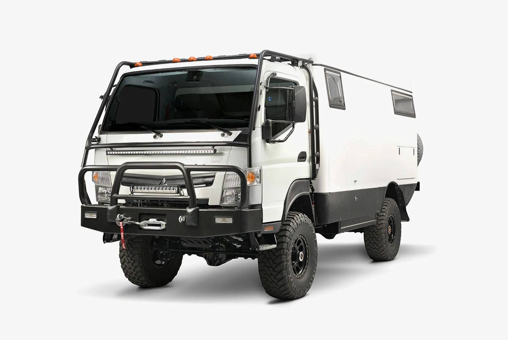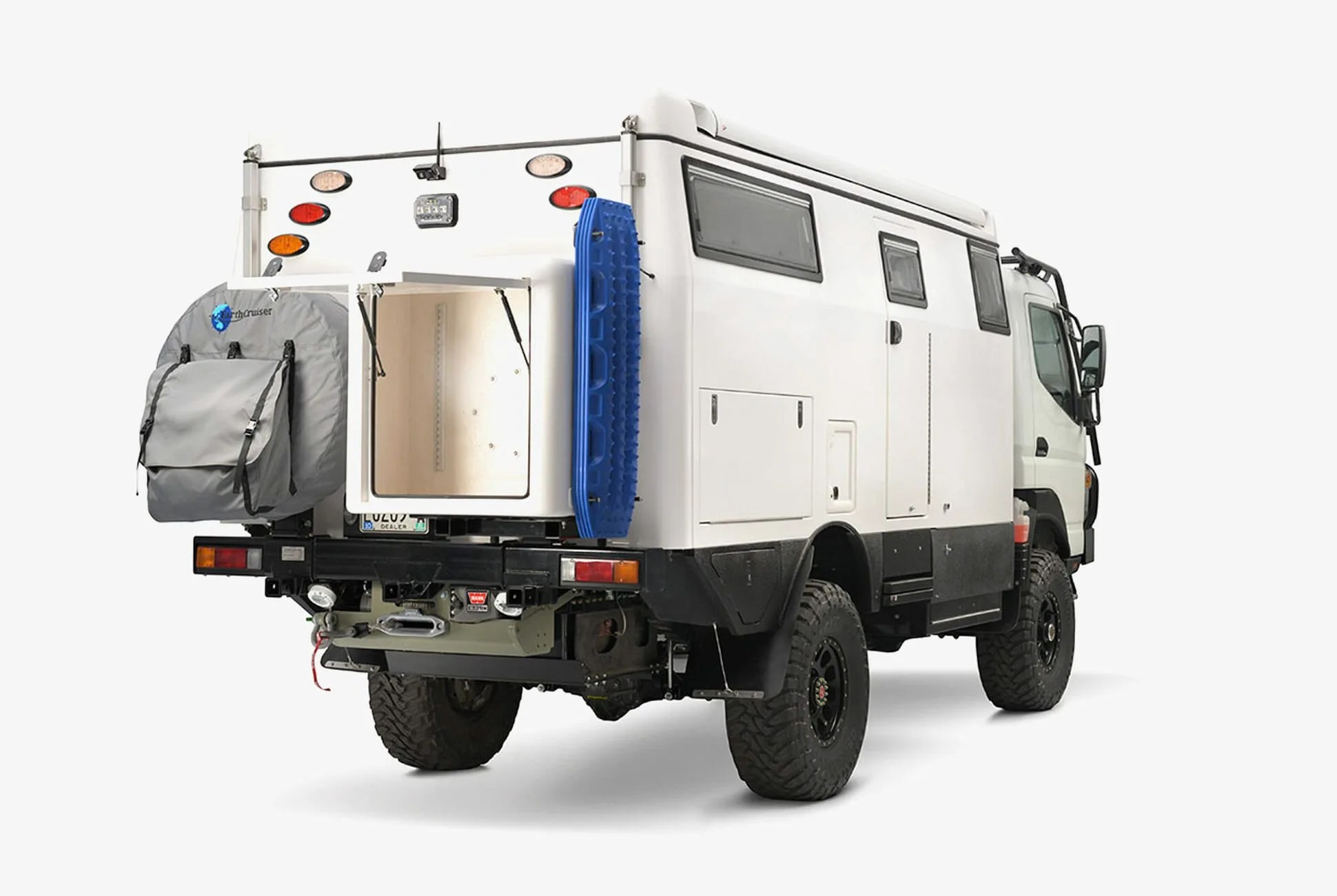 Admittedly, the EXP isn’t the sexiest off-road vehicle we’ve ever laid eyes on. The base vehicle is a Mitsubishi Fuso, one of the myriad generic commercial truck platforms that roam the streets of just about every continent but never draw so much as a second glance. While that basic Fuso is two-wheel-drive, EarthCruiser starts its build by outfitting the truck with its own four-wheel-drive system, complete with two-speed transfer case, full floating axles and air-powered locking hubs. (The latter’s twin air compressors can also be used to top up the tires.) With more than 11 inches of ground clearance, it can scramble over rocks that would gut mere Wranglers and Land Cruisers.