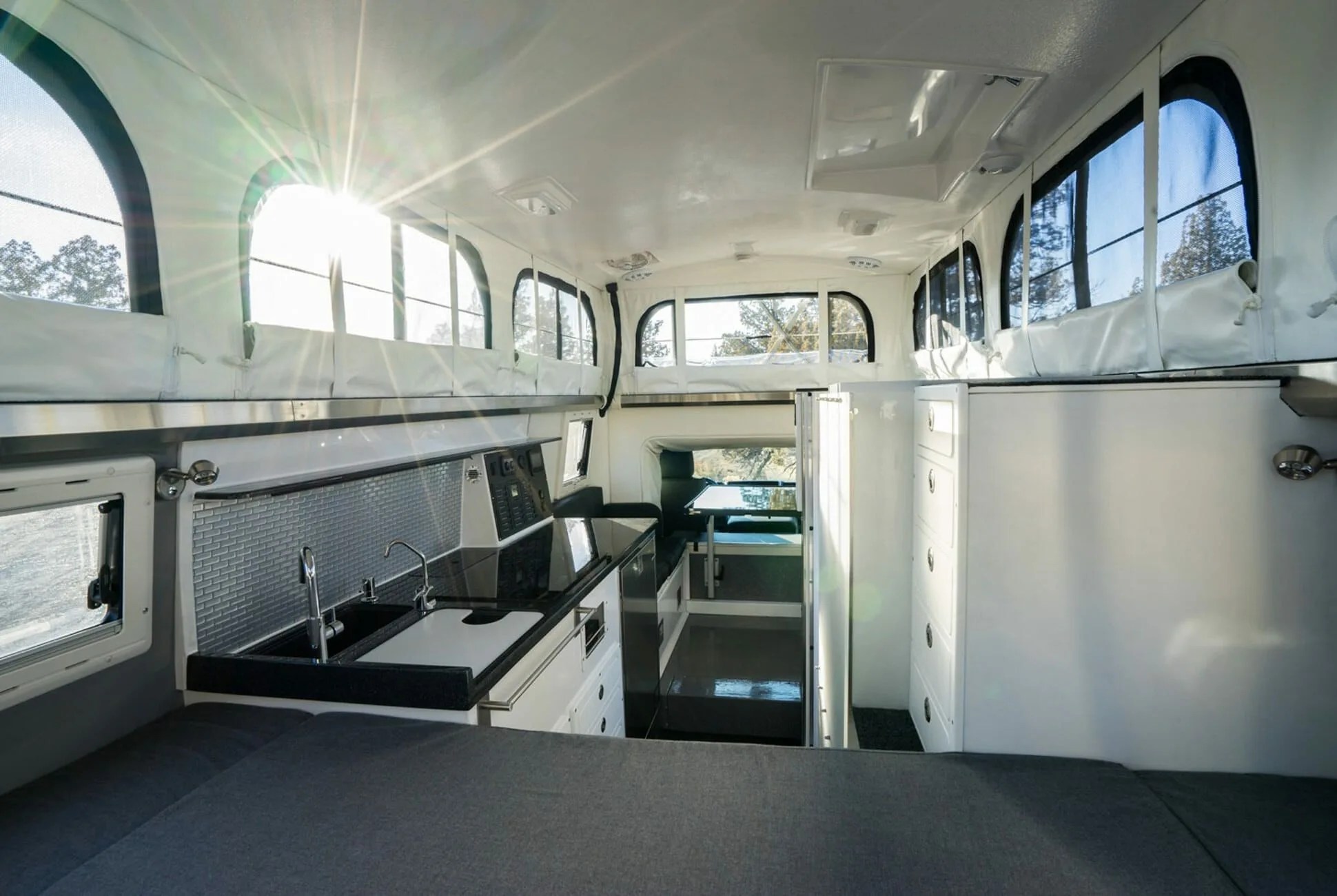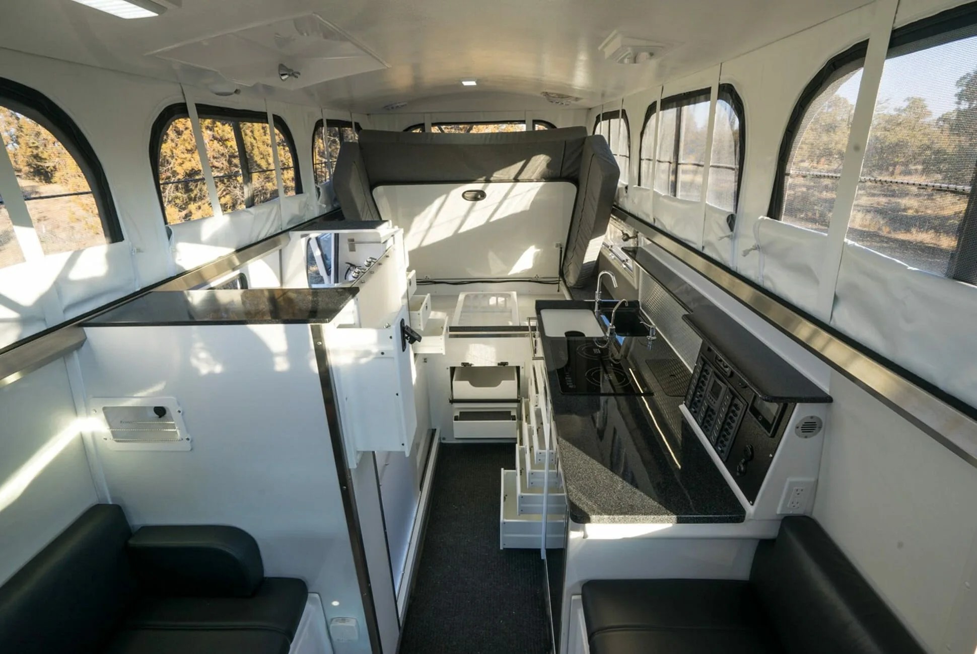 Of course, an overlanding rig isn’t worth much if it doesn’t feel cozy when you’re parked. To that end, EarthCruiser builds a custom pop-top living compartment for the EXP, complete with a proprietary mounting system that lets the box flex separately from the frame during off-roading. Once stopped, the top rises to provide 6’10” of head room, while windows in the tri-layer, weatherproof laminate let you see out and let the light flood in. There’s standard sleeping accommodations for four adults — two in the dedicated bed in back, and two more once you convert the four-seat dinette to a bed — and you can add on a “sky bed” to sleep one more grown-up or two kids.