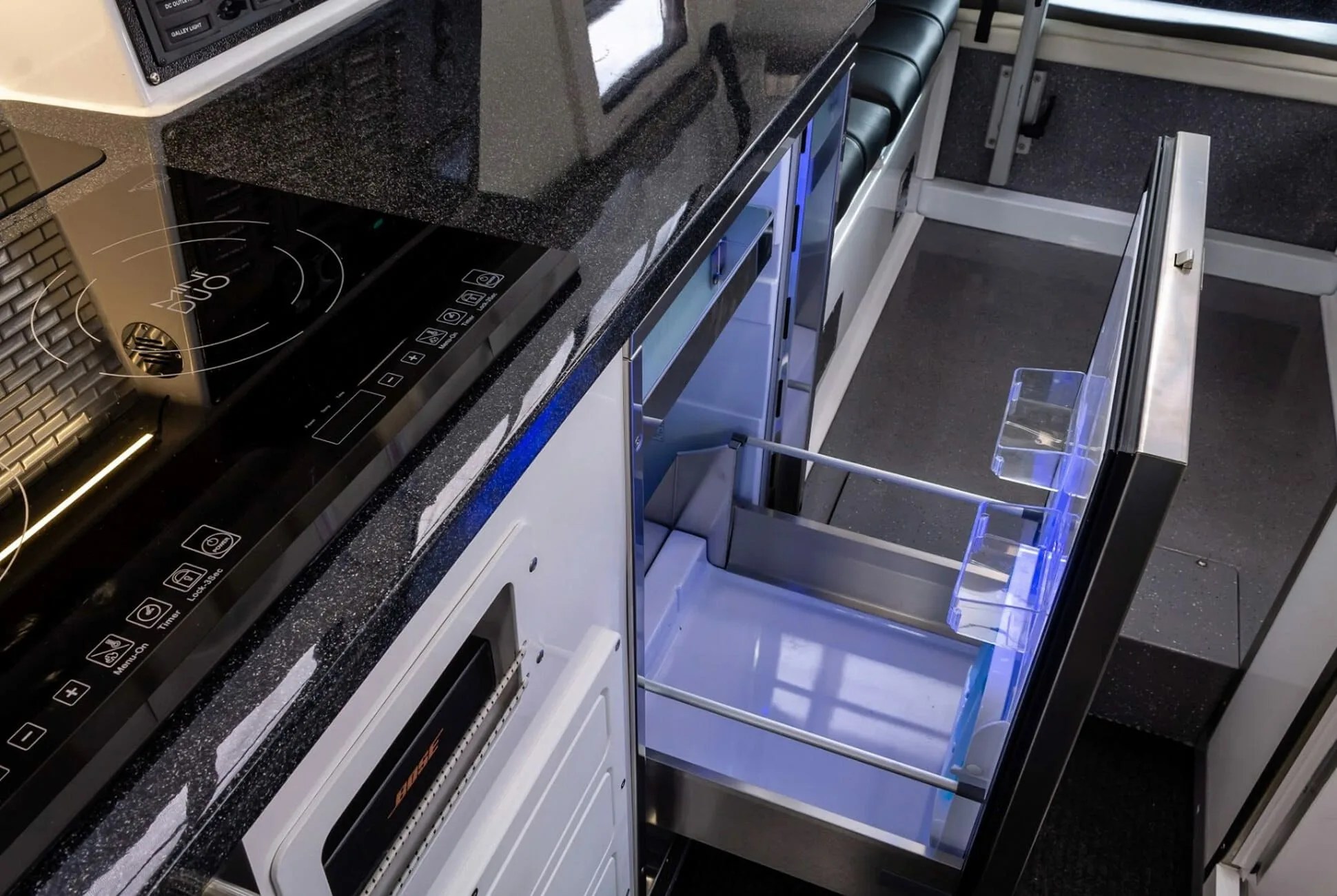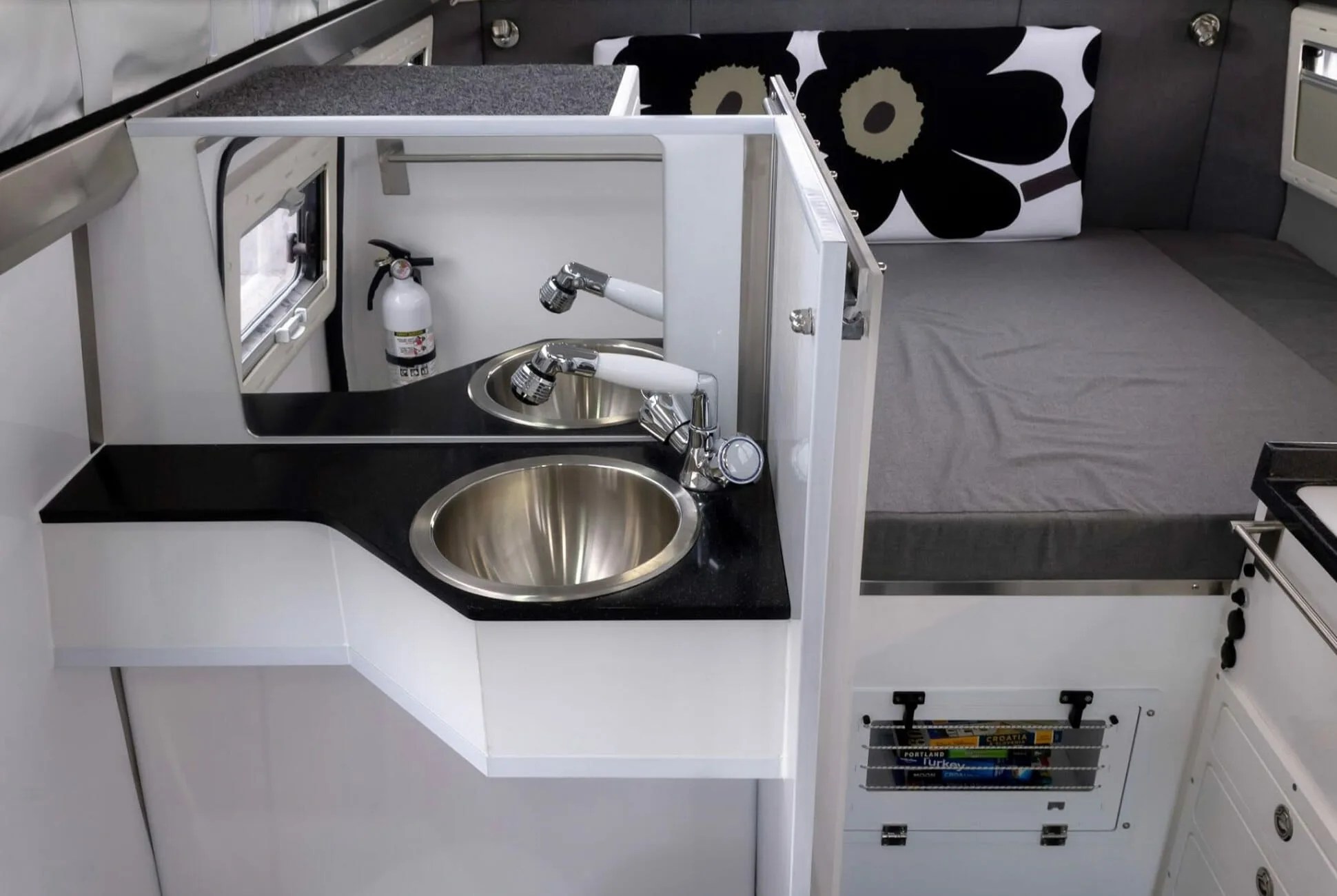 The wet bath, cleverly, is located in the entry way, as that makes for the easiest place to clean muddy gear from the outside without tracking it everywhere. (There’s a pass-through to the cab from the cabin, so you can still get out the truck’s regular doors.) 80 gallons of fresh water serve said bathroom, with clever thermal management systems designed to keep the water from freezing no matter how cold it gets outside. A separate air and water heater is fed by a 15-liter diesel tank, while a trio of 160-watt solar panels help provide juice for the lithium-ion battery.