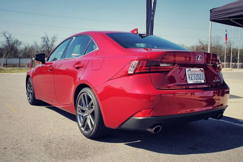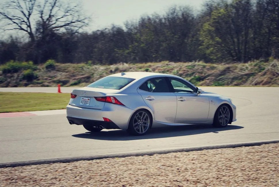Our afternoon with the IS 350 F Sport at the Driveway Austin track was spent unleashing our inner boy racer at triple-digit speeds, driving the IS back to back with a BMW 335i and a Mercedes C350 Sport. The winding, elevation-varied track features two straighter sections made for flat-out pedal/metal interaction. Rear-drive IS 350s feature an eight-speed Sport Direct Shift automatic transmission, and in Sport+ mode (F Sport only) Lexus’s “G-force Artificial Intelligence” holds gears longer and delays downshifts based on braking and cornering G-forces. It works so well we blasphemed and all but ignored the wheel-mounted paddle shifters.