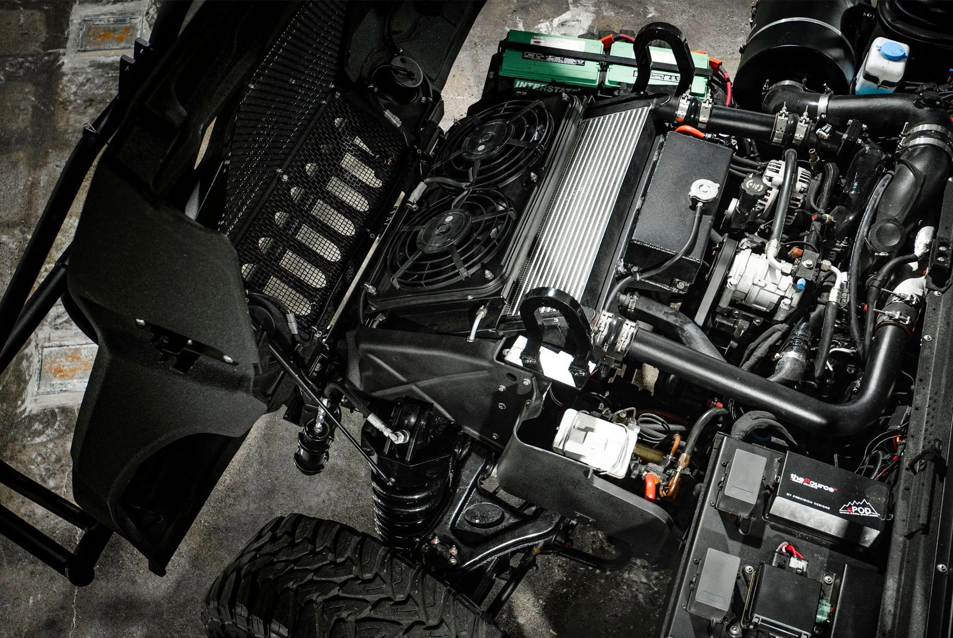 While GMC is bringing the Hummer back with electric power, Mil-Spec sticks with the LBZ 6.6 liter Duramax Diesel engine, which puts out 500 horsepower and 1,000 lb-ft of torque. The company has improved the H1’s overlanding range the old-fashioned way, with a massive 30-gallon fuel tank. Other mods include a Baja Suspension package, which permits 13 inches of wheel travel and a Bumper Tow package.