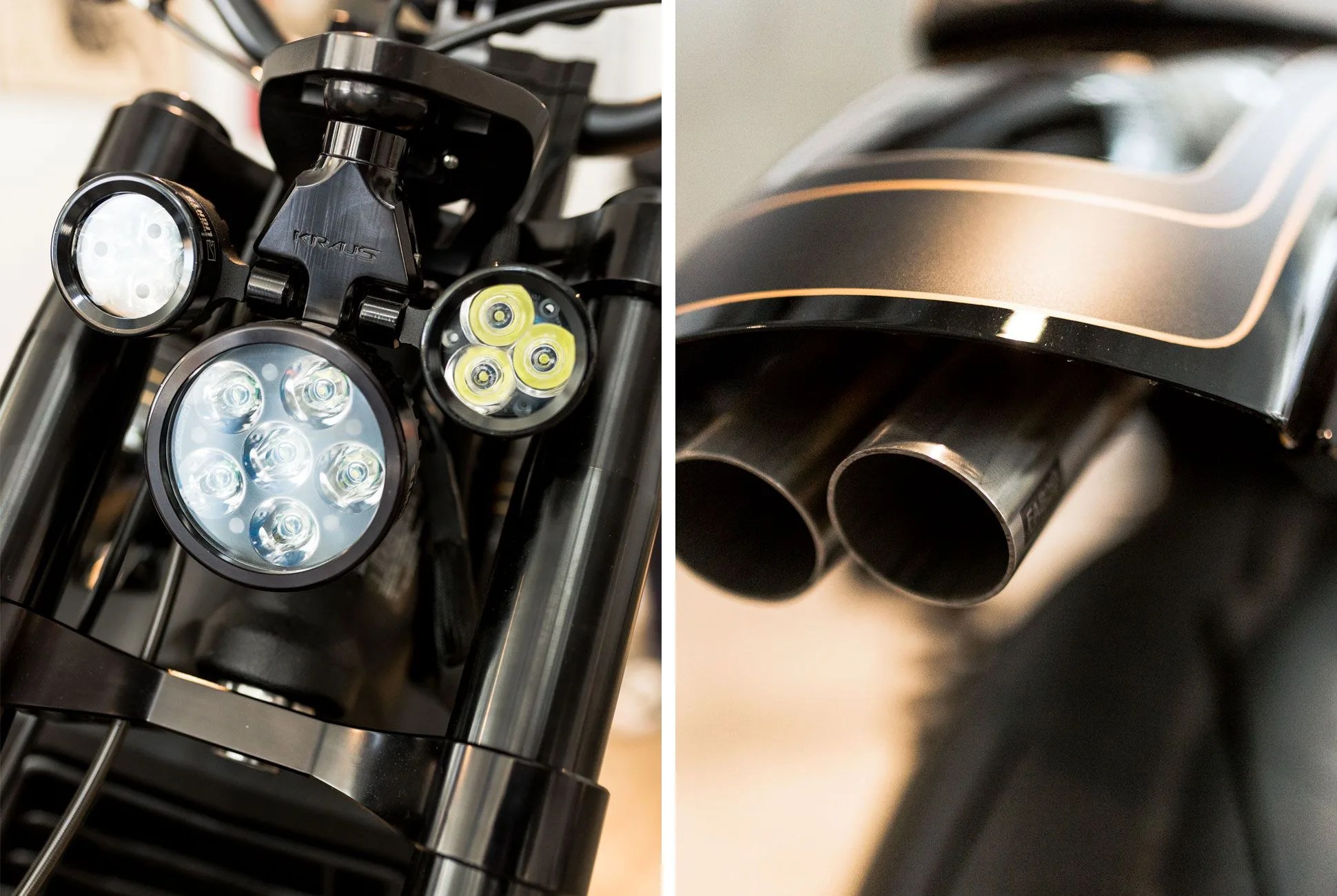 A: There are a few things we did that are pretty cool on this thing. Sometimes, my favorite details aren’t because they’re the most beautiful or it looks the best — usually my favorite details come from the amount of work and energy and the amount of attention it takes to build and develop. On this bike, the rear fender struts. They actually reposition the rear suspension and it brings the bike up into a better stance and changes the overall feel of the bike. It makes the bike a lot more aggressive.