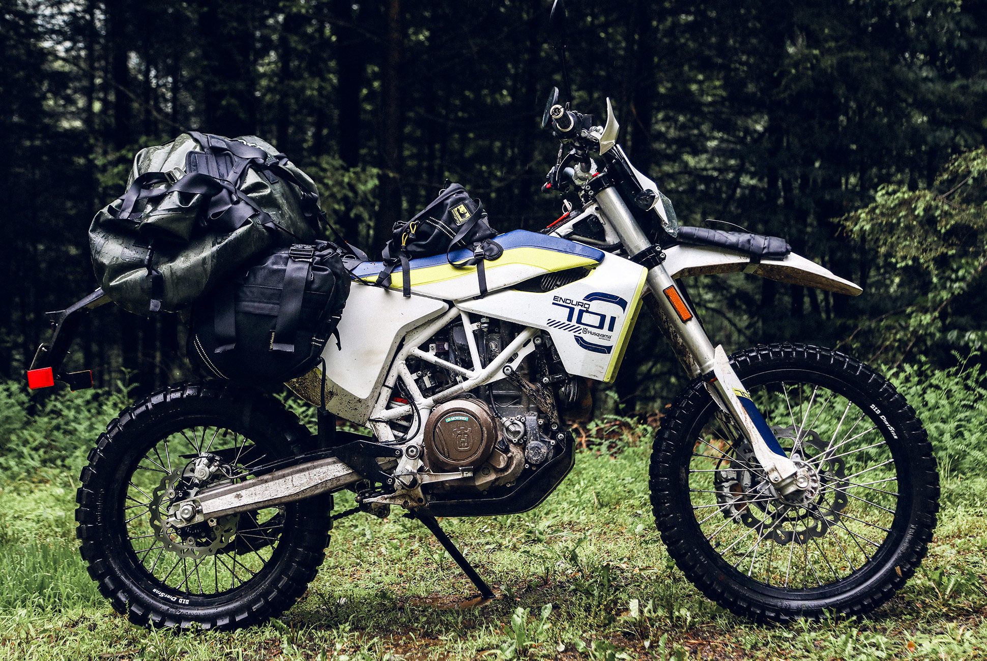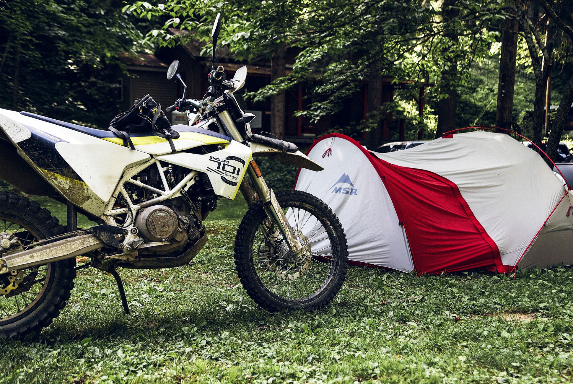 I was heading out to Woodward, Pennslyvania for a weekend of camping and trail riding, but just the idea of wrestling a 560 lb motorcycle all day on narrow, rocky trails (interspersed with multiple deadlifts when the bike inevitably landed on its side) was exhausting. The 2018 Husqvarna 701 Enduro stood out as the best alternative. I could throw saddlebags and a duffle bag on the back for my gear and clothes, but then unpack it all at camp and have an unburdened, lightweight performance machine to rip single track trails. This is the gear I built an all-out adventure bike with out of a svelte, nimble enduro.