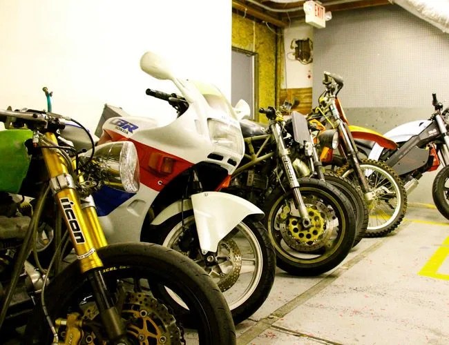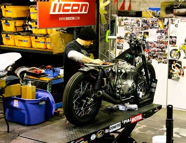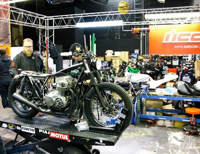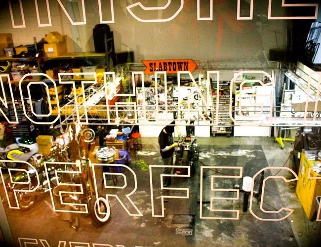 A single window looks out over the Icon garage from the clubhouse perched upon the second floor. Peering between the company’s mantra (“Nothing is Finished. Nothing is Perfect. Everything is Process.”) plastered across the window, we could see at least a few new builds underway down below. Apparently it’s like this all the time: they build them, they break them, they do it again. In the early days, the bikes on the lifts were either budget Craigslist finds or, more typically, bikes that belonged to staffers; everyone working at Icon rides, and everyone has a project bike.
