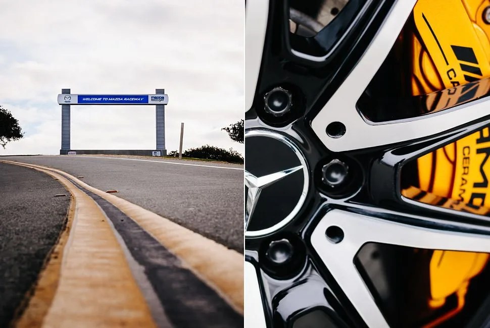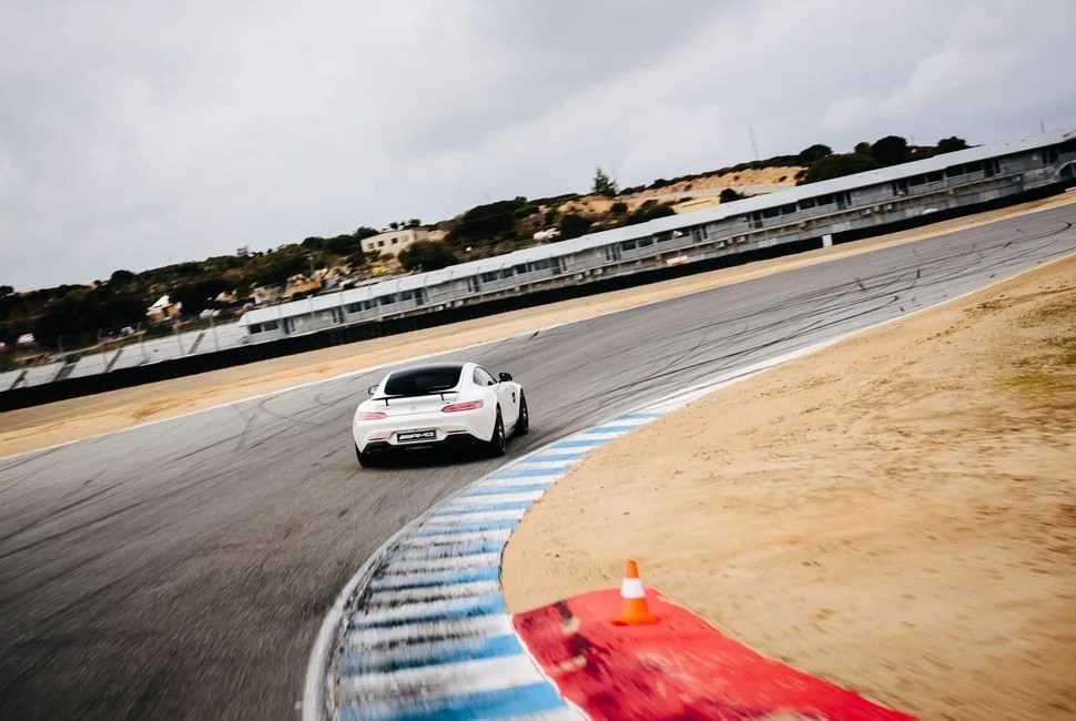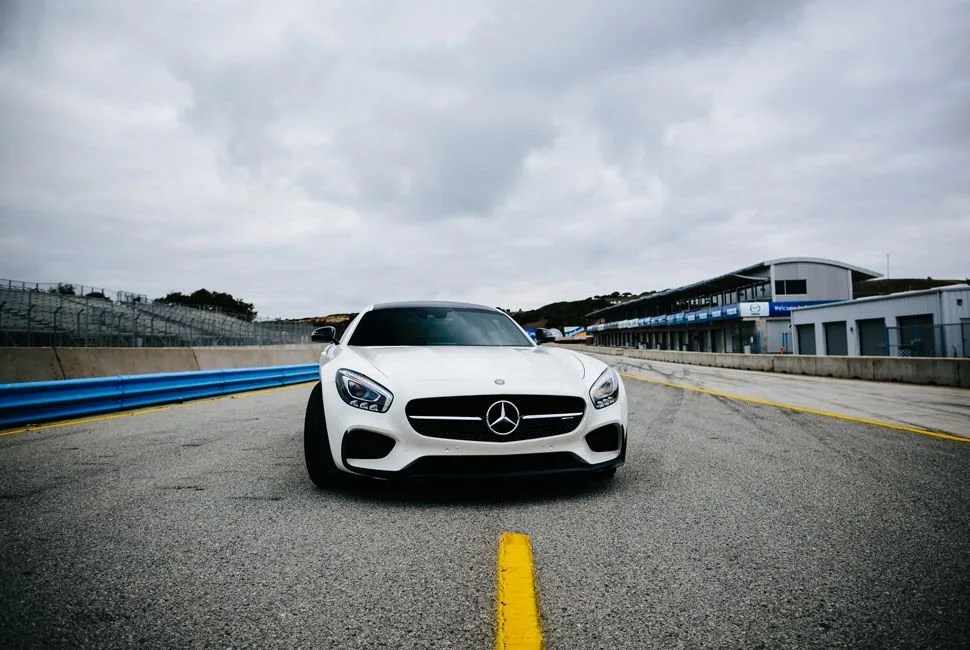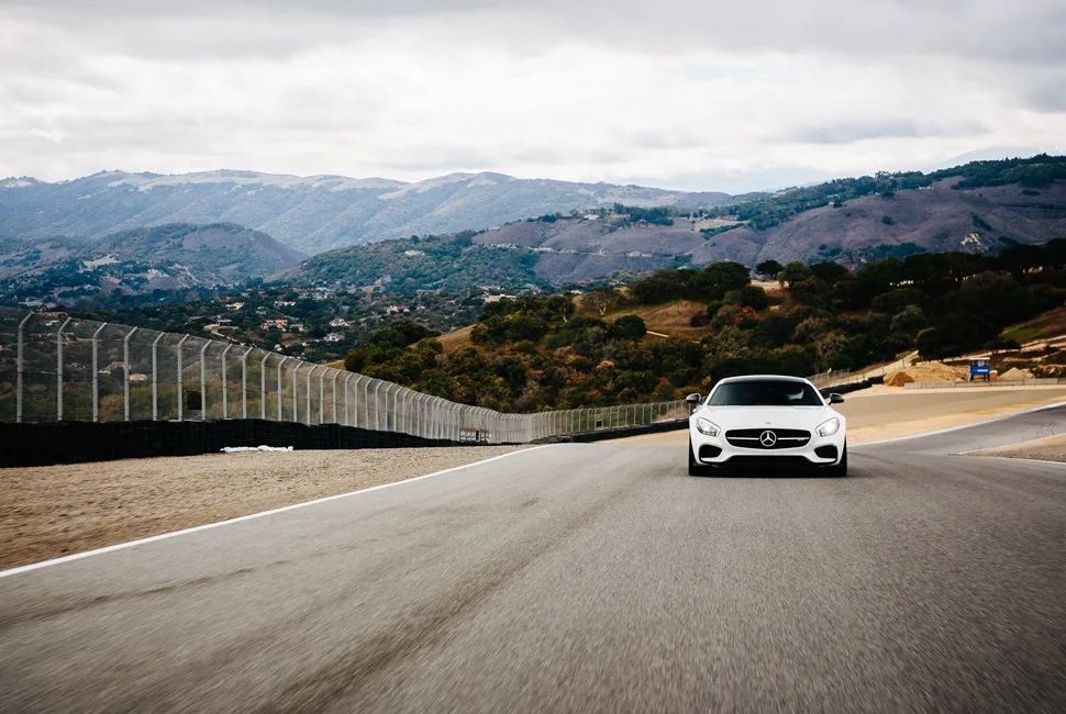 We stand in the gravel just off Turn 6, and from the distance comes what sounds like the roaring Merlin engine of a WWII Spitfire. The roar builds quickly, the unseen source making its way up the long rise to the top of the curve. Then the Mercedes-AMG GT S hurtles over the curve, pummeling the apex so hard that it seems to push the track a few inches deeper into the earth. Its power is intoxicating: on a hillside at the edge of the track, twenty feet above the asphalt, a fan camped out in a tent whoops and hollers like a concert-goer begging for an encore.