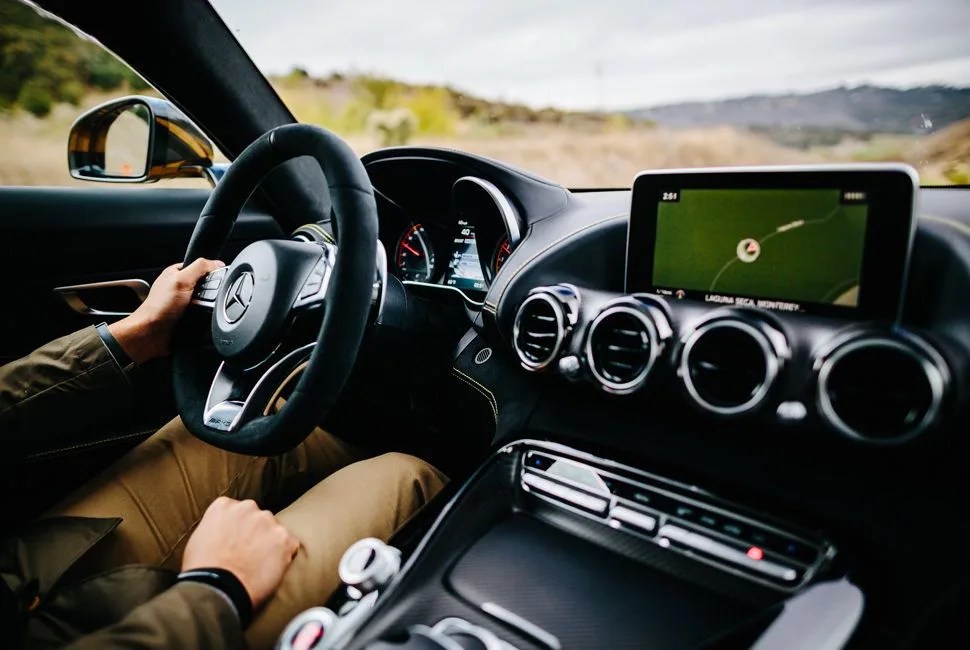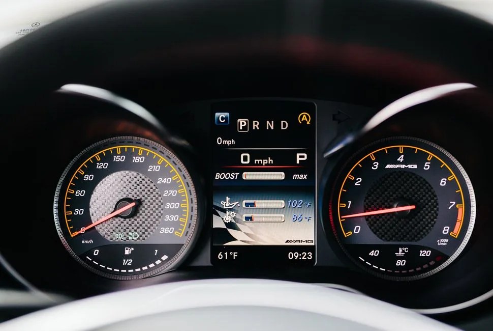 That roaring motor under the hood is a 503-horsepower twin-turbo 4.0-liter V8. It benefits from “hot inside V”, which means the turbos aren’t mounted outside the cylinder banks but within the engine’s V-configuration. The engine is thereby smaller and set lower in the engine compartment; it also benefits from dry sump lubrication. The resulting lower center of gravity and improved weight distribution are a boon to the AMG GT S’s handling, making for some truly heroic turns on the track.