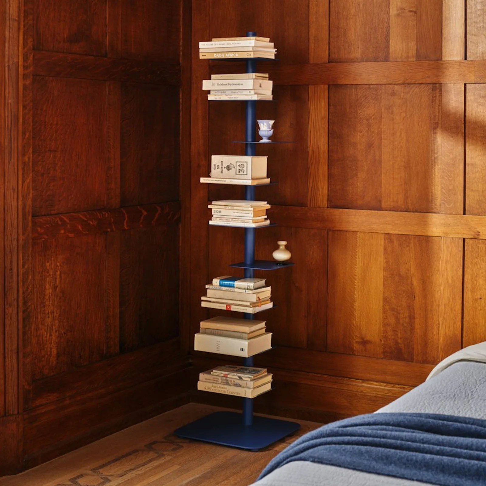 What makes this vertical bookcase special is the ability to rotate any of the shelves around the central pillar to suit your space. It’s available in two different heights and five different colors.