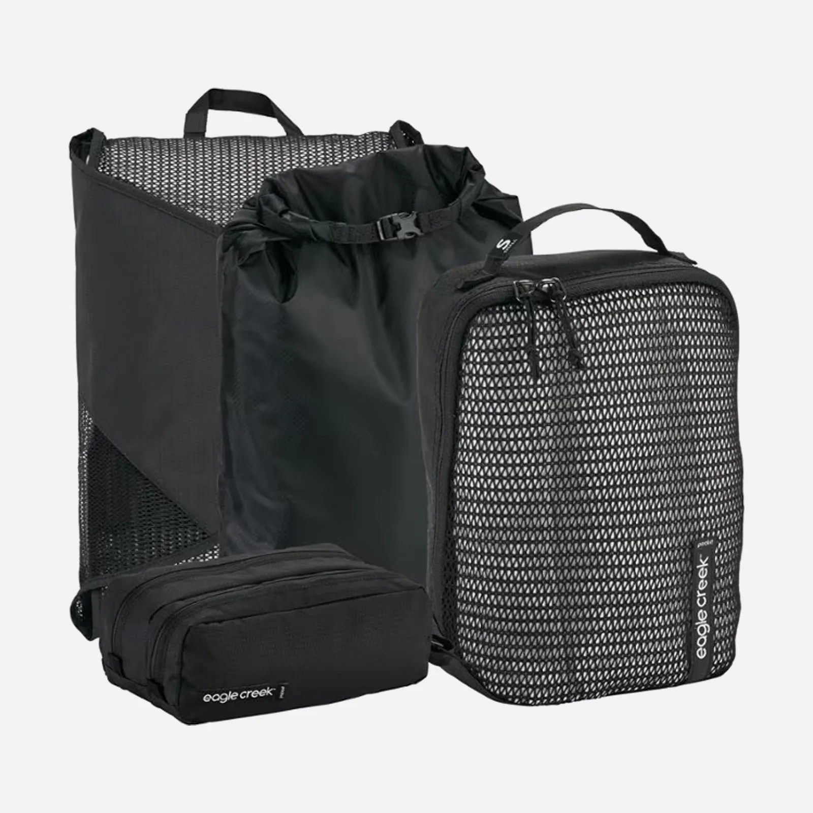 Eagle Creek is the OG packing cube brand. This collection includes everything most people need for a trip including a shoe sack, a smaller cube, a bigger cube and a garment folder.