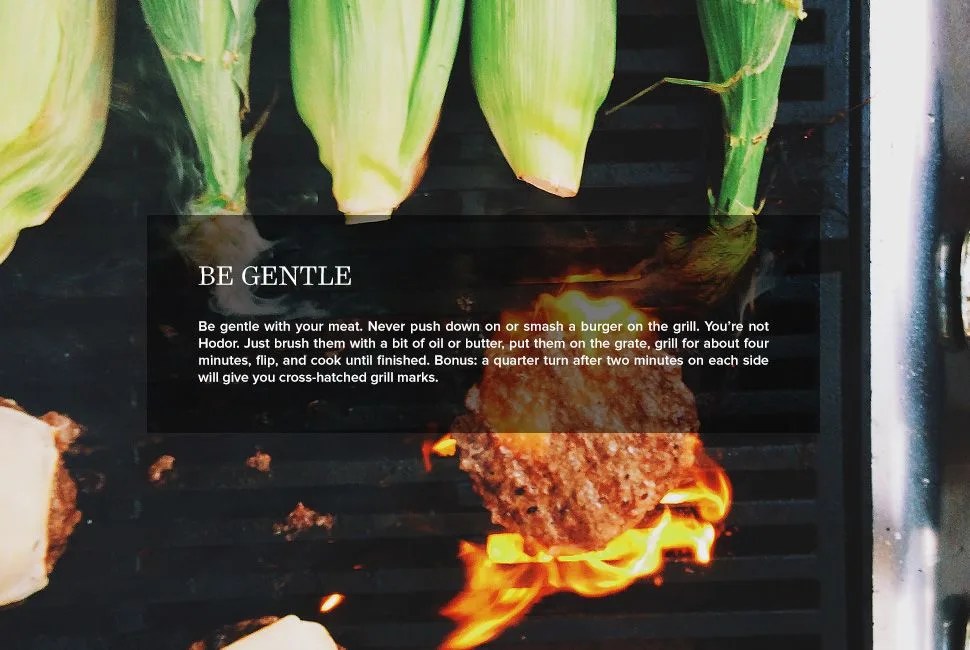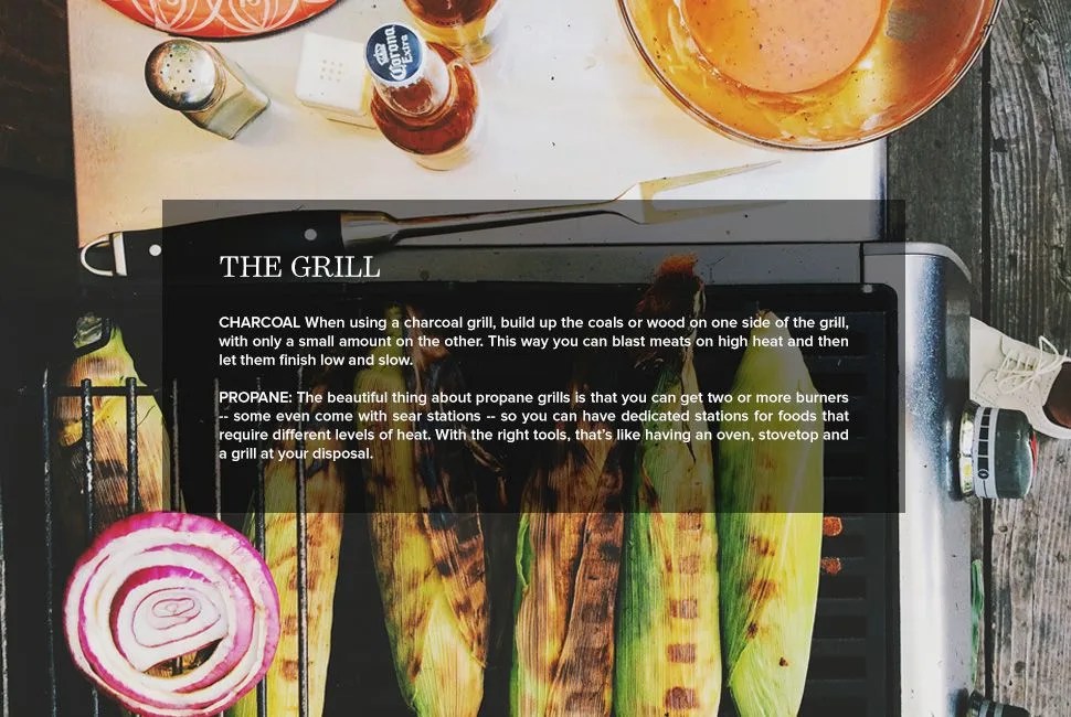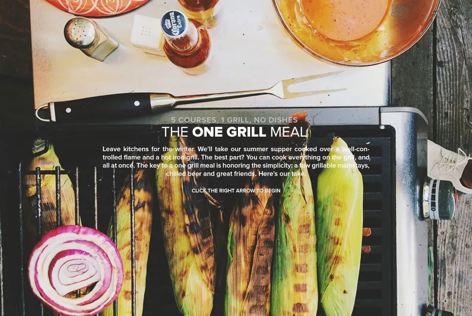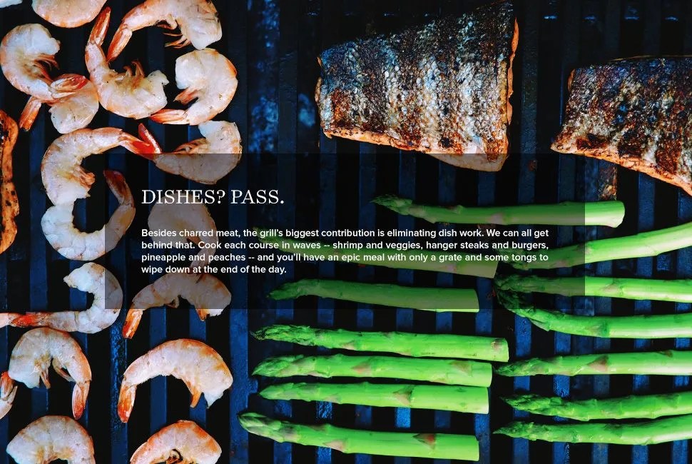 3 Essentials You’ll need a few essentials, but the basics are a durable grill, a pair of steel tongs (crucial), a generous glass or stainless mixing bowl and a platter. Plates if you want them but if your guests number in the 4-5 range, then consider having everyone join you around the fire and serve them directly — fire to mouth, beer in the left, dog in the right. You can ratchet up the presentation with plates and platters, and that’s fine and good, but part of what makes a one grill meal so great is its casualness. Like a chef’s table, but in the kitchen and around the pan.
