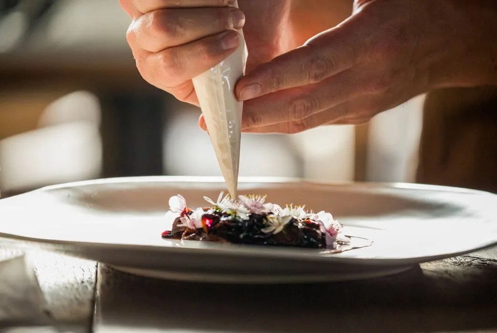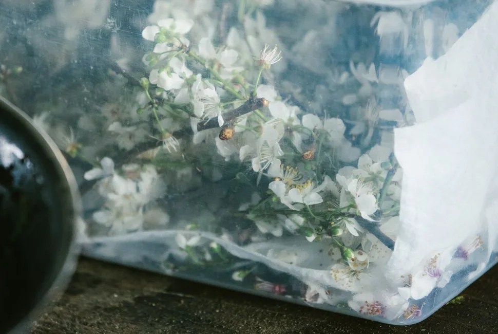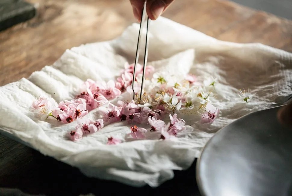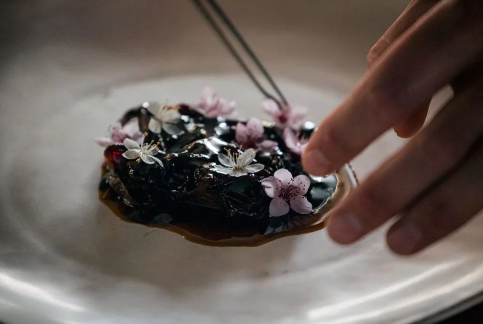 Guzmán opens a plastic container with a black syrup made from Patagonian maqui berries and proceeds to coat the meat. He’s trying to treat the dish like a dessert; he’s had this idea since January, but has been waiting for the cherry blossoms that color Chile’s central valley every spring. Both men use tweezers to carefully place the flowers, which are sourced from nearby almond and plum trees around Santiago. A final dollop of almond puree (meant to mimic the taste of Chilean kefir, yogurt de pajarito) is added on top.