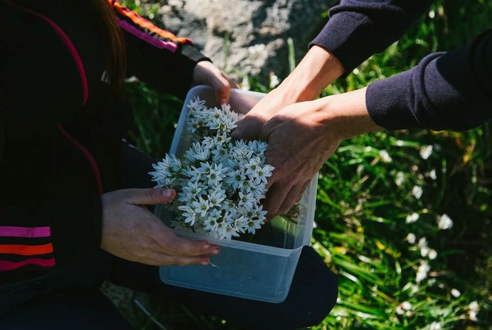 A little farther on, he spots a patch of white flowers and runs over, his jeans sinking below his hips. Sea stars. I pluck one and eat it. There’s a hint of spring onion before a wave of honey. “They’re amazing!” says Guzmán, who says he’s been waiting all year for them to show up. He plucks them by the base of their stems, making bouquets and stacking them in the tub. There’s a possibility of rain next week, which could wipe them out for another year. “Hopefully they’ll come out again,” he says, “but we learn to adapt ourselves to what we have.” I ask what he plans to do with the flowers and his face lights up with a grin. “It’s a surprise,” he says.