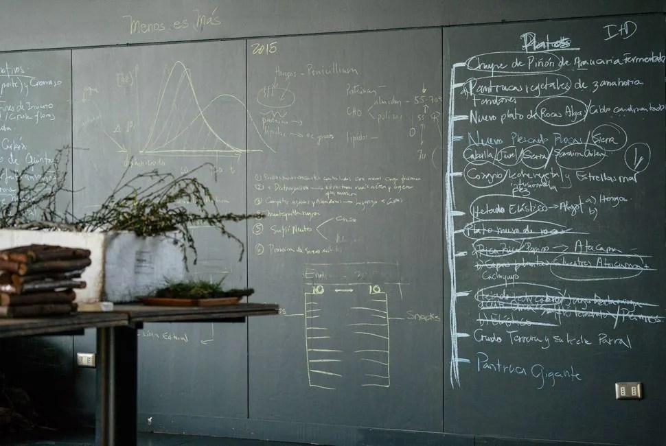 The walls here, painted black, are covered with chalk. They chart the night’s 18-course tasting menu, along with a step-by-step preparation of Guzmán’s latest creation: a carrot infused with live cultures that “melts in your mouth like Camembert and is the craziest fucking texture” he’s ever tasted. The words menos es más — “less is more” — are scribbled at the top of a large wave diagram near the ceiling. Guzmán escapes downstairs for coffee, leaving me alone to wander. By the window, a bookshelf is lined with culinary titans — Redzepi, Andoni, Adrià. Below them are boxes of ingredients labeled with names I don’t understand: “Conchas Picorocos,” “Rica Rica.” From the far end of the room, it all looks like the makings of one big science fair project. Guzmán returns to find me nose deep in a bowl of wet moss.