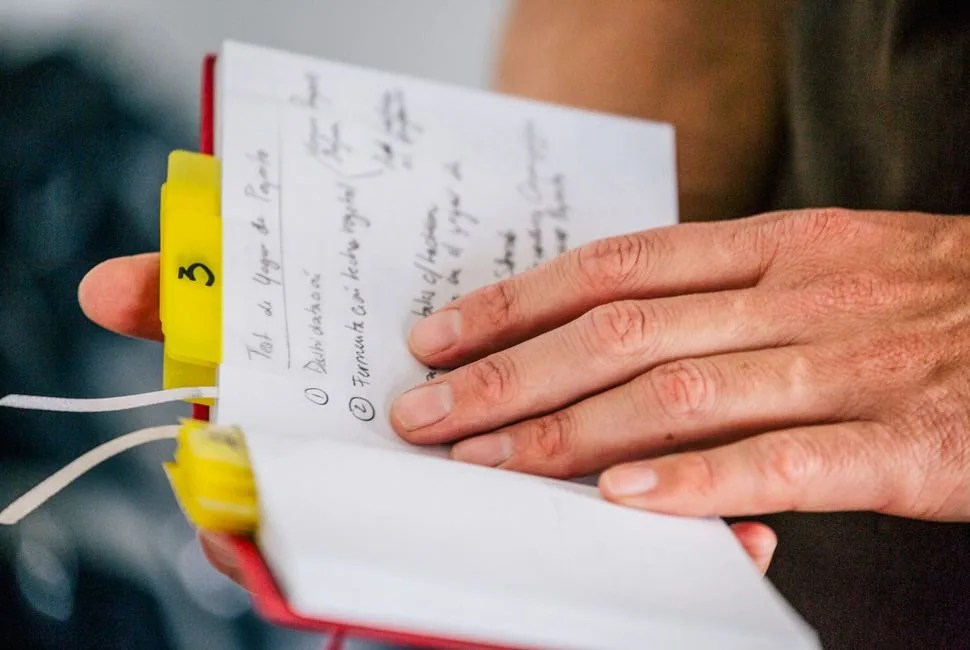 The next afternoon, I ring the bell to the test kitchen for my final visit. A short man with a mustache and slicked-back hair answers the door. I recognize him from the night before as Koto Sierra, Boragó’s sous chef. He’s noticeably younger than Guzmán, with gauges in his ears. He shakes my hand and I notice his arm is tattooed with produce — red onions, the outlines of mushrooms.