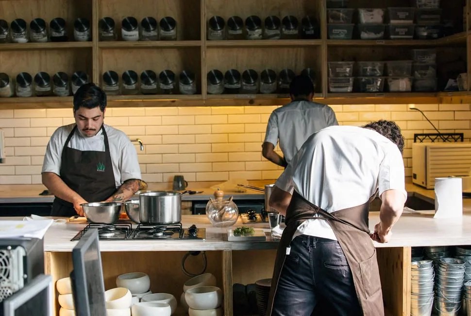 Guzmán is by the stove, dressed in his chef ’s whites with a brown apron tied around his waist. A sharp hissing escapes from a pressure cooker. He tells me they’re working a new dish to debut next week, one made with the deer-like guanaco, sourced from his guy in Patagonia.