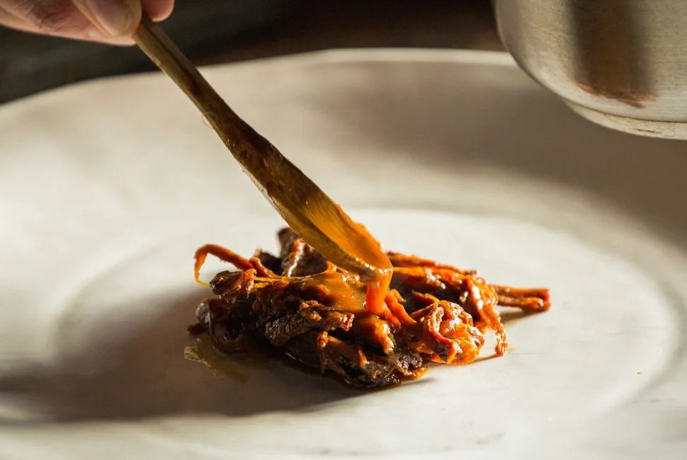Then the the two men tear it apart — first with wooden spoons and then their fingers. Each bite changes the proportions of the components. More meat. More syrup. Guzmán uses a squeeze bottle to add the almond puree between his thumb and index finger, licking it off with his eyes closed. They mumble with a hurried intensity: “The guanaco has to be richer.” “Smoked? What do you think?” “There’s too much sugar.” “We need more acidity, more almonds, more bitterness.” “More flowers, more flowers!” Guzmán takes a handful of cherry blossoms and splashes them down on the guanaco. The whole scene unfolds in under a minute. By the end, there’s just an empty plate with streaks of syrup and a couple stray petals.