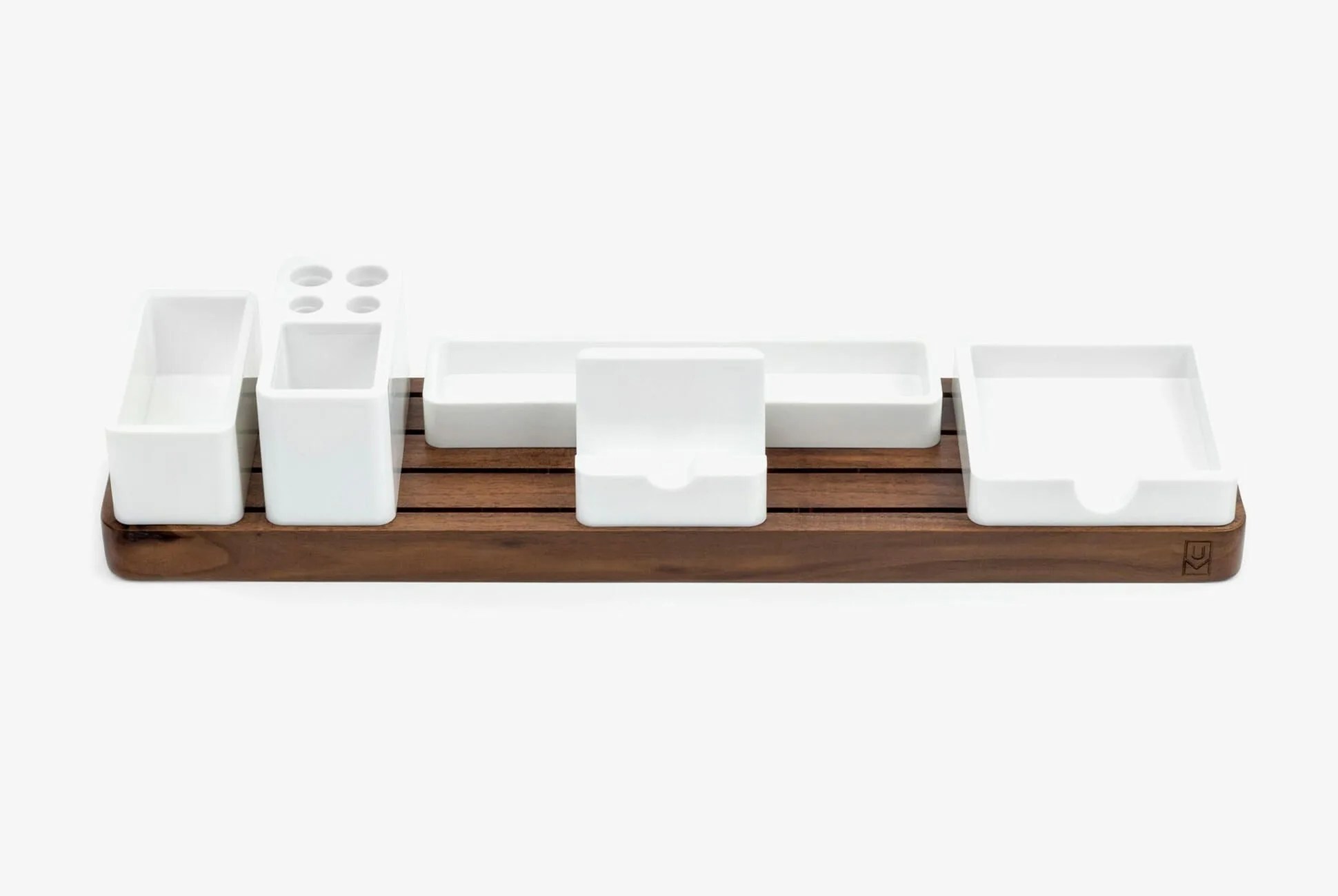 The beauty is in its simplicity — it’s a rectangular board with four parallel slots that accept an array of ABS thermoplastic (what Legos are made of) organization tools. The basic set includes a sticky note holder, a phone holder, a small tray (coins and thumbtacks) and a large tray (pens and pencils). The extended version tacks on a cork coaster and a headphone stand. The organization system, which comes in a light maple or dark walnut, is also available for bulk order, where each additional set is 20 percent off.
