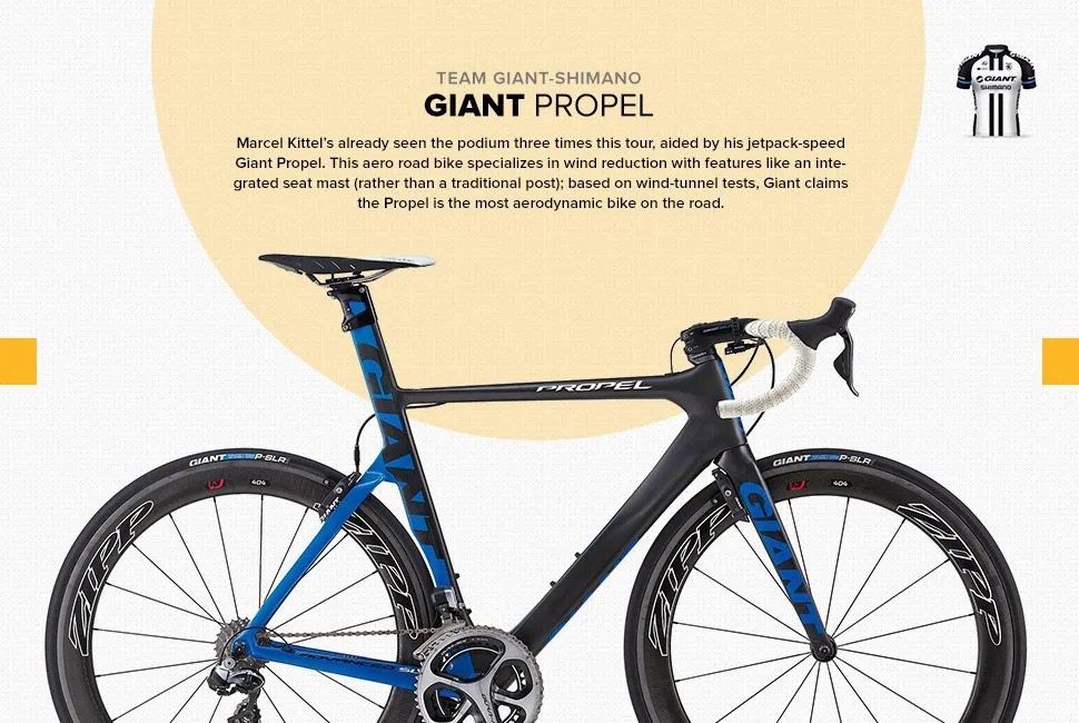Froome’s out of the race, but that doesn’t mean the F8’s not a podium contender with Richie Porte pushing its pedals. Ditching the ubiquitous Pinarello swivel on the fork and seat stays, the F8 makes bold lines with ultra stiff, lightweight T11001K carbon. Pinarello claims it’s 120 grams (4.2 ounces) lighter and 12 percent stiffer than the Dogma 65.1; Pinarello also worked with Jaguar to make the bike more aerodynamic.