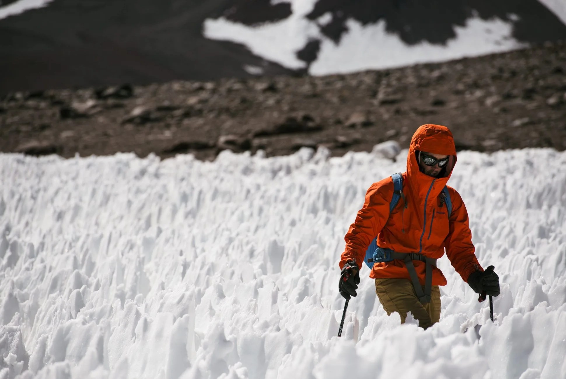 Life at 14,000 feet is simple but hard. You must move slower, take more breath, think harder. At this elevation, there’s only 60 percent of the oxygen found at sea level; at 22,600 feet, it’s 40 percent. The high desert amplifies the sense of distortion. There are no trees, of course. Only monochromatic sand and rock. Meat-locker cold and constant wind. The occasional mirage. A circling, hungry-looking bird. But most of all: these huge mountains, decorated with strange penitentes: clusters of icy spires sticking straight out of the ground towards the sun. An absurd arctic art project, by the Great Unseen Hipster Artist in the Sky.