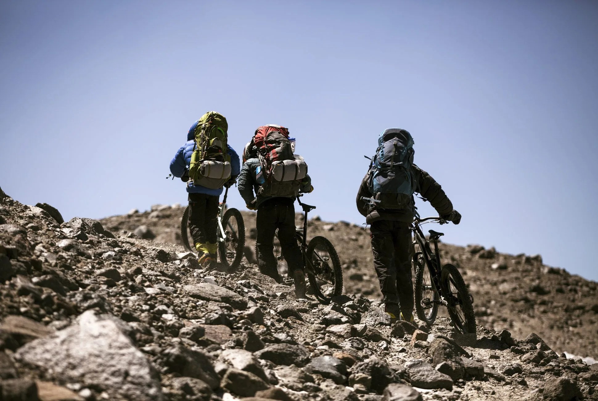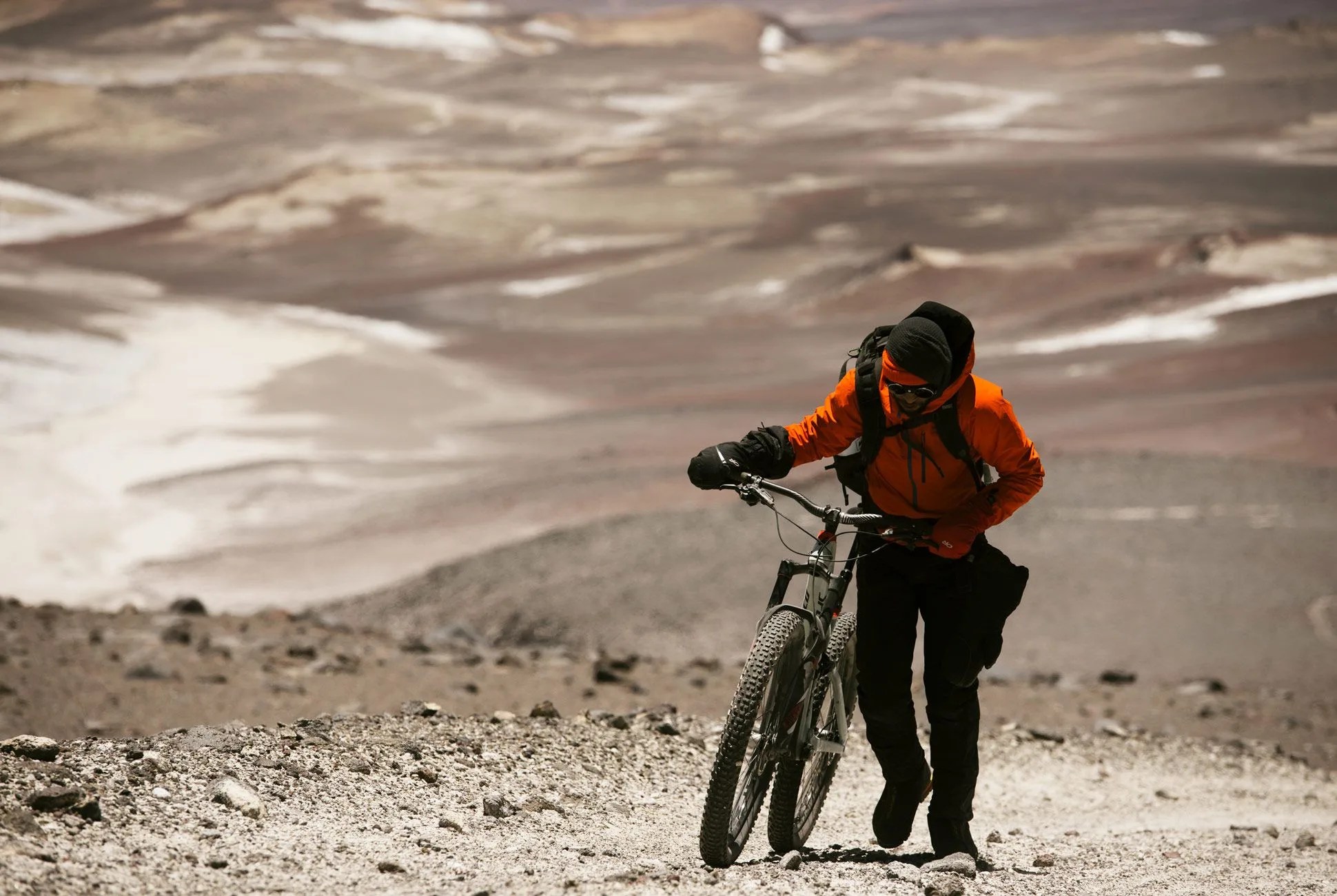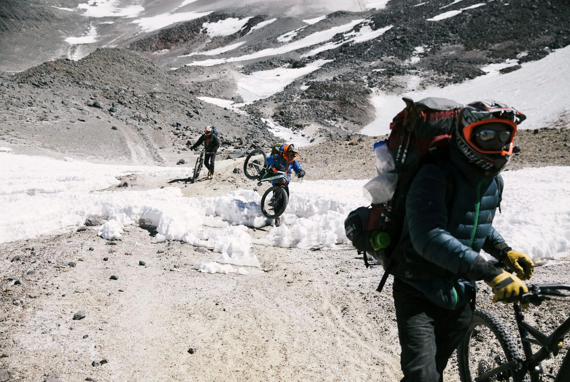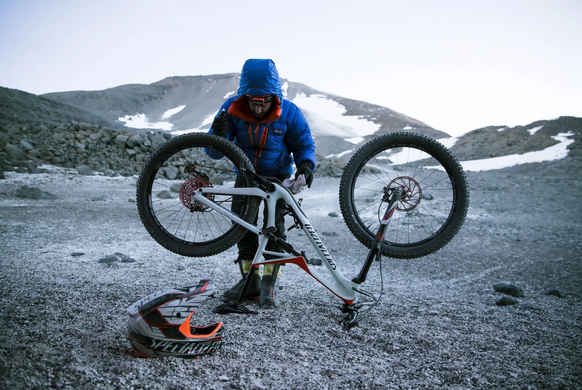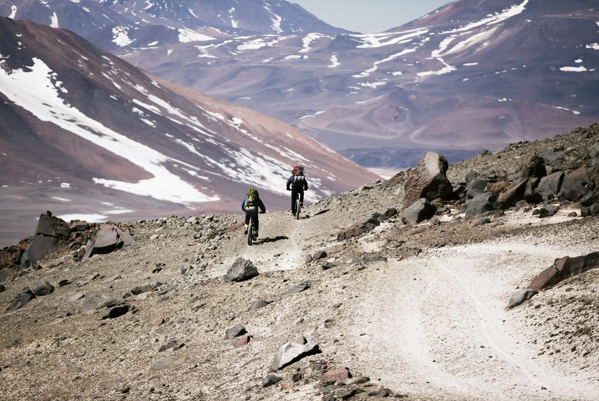 We finally mounted our bikes — with heavy packs returned to our backs, mountaineering boots still on our feet, face-masked helmets on our heads, anticlimactic words escaping our smiling, chapped lips — and prepared to ride down 4,000 vertical feet of ancient volcanic scree and sand, past the penitentes pleading to the bright, empty sky; past the hundred places we’d stopped to rest or react to our surroundings on the way up; past the footprints of the bodies and brains that had hatched this ridiculous plan and landed this crazy assignment, to our truck, which would take us back to thicker air and dimmer stars. I took off after everyone else, behind my brother, who let out a barbaric yawp. I tried to make it last.