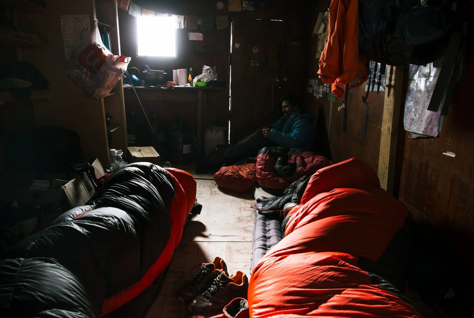 After nodding off around nine, I woke to piss, again, at 11:45 and mostly rolled around for the next four hours, listening to gaseous bugle calls from neighboring bunks until alarms blared mercifully. It was -25 degrees and windy when I stepped outside a little after four in the morning. We’d made coffee, eaten a few muffins, put snacks and water in our lightened packs and layered up. We wore two pairs of socks inside our La Sportiva super-gaiter boots.