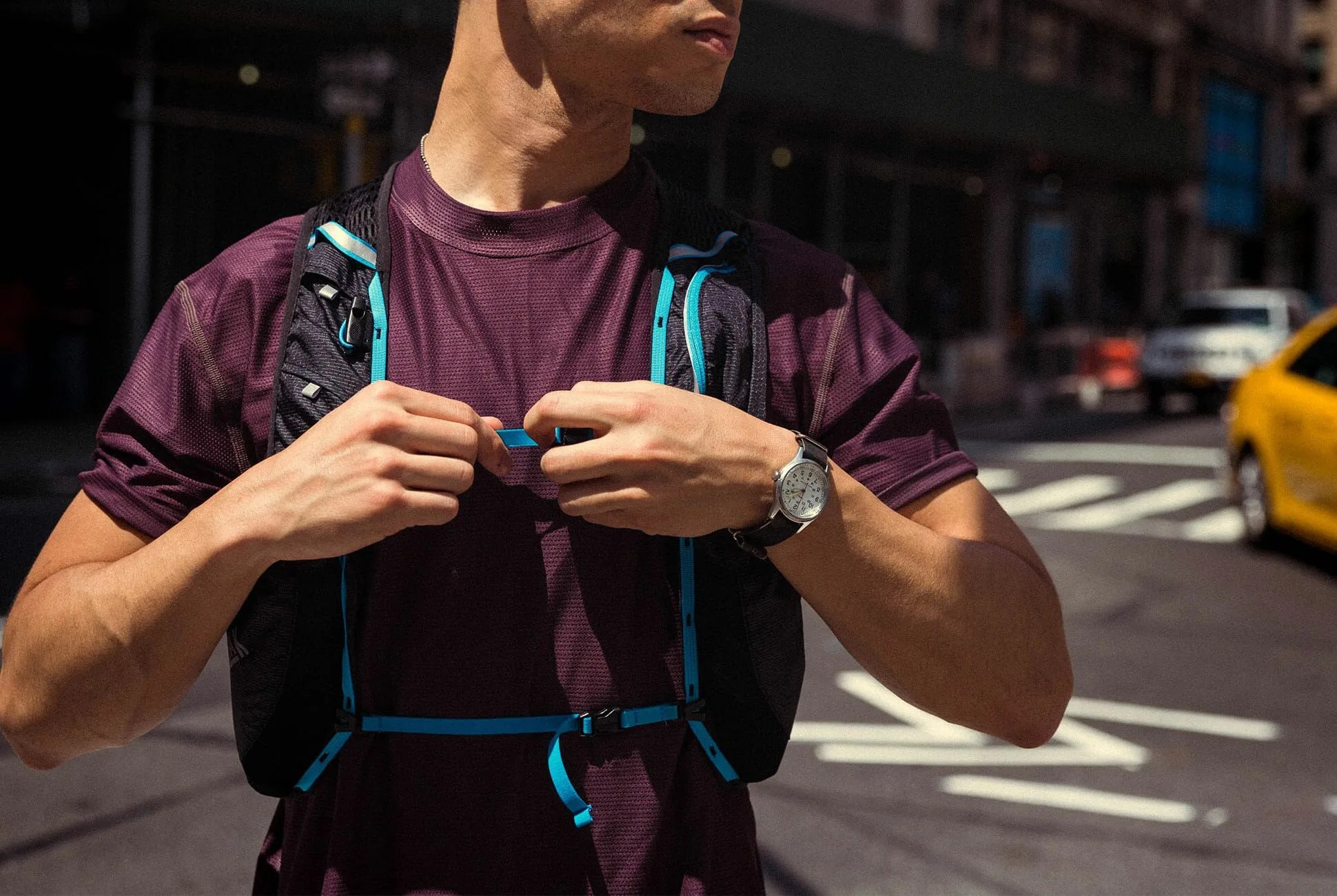 If you’re going to run far it’s better to wear less, but that doesn’t mean sacrificing style. Satisfy produces a high-quality line of running apparel that pushes the boundary of activewear until it intersects with fashion. The Light Tee and Short Distance Shorts are simple until you notice the bonded hems and flat seams that detail the technical four-way stretch Swiss fabric. Add Feetures! High Performance Cushion No Show socks and CamelBak’s superlight hydration vest, and this becomes a kit with miles of capability.