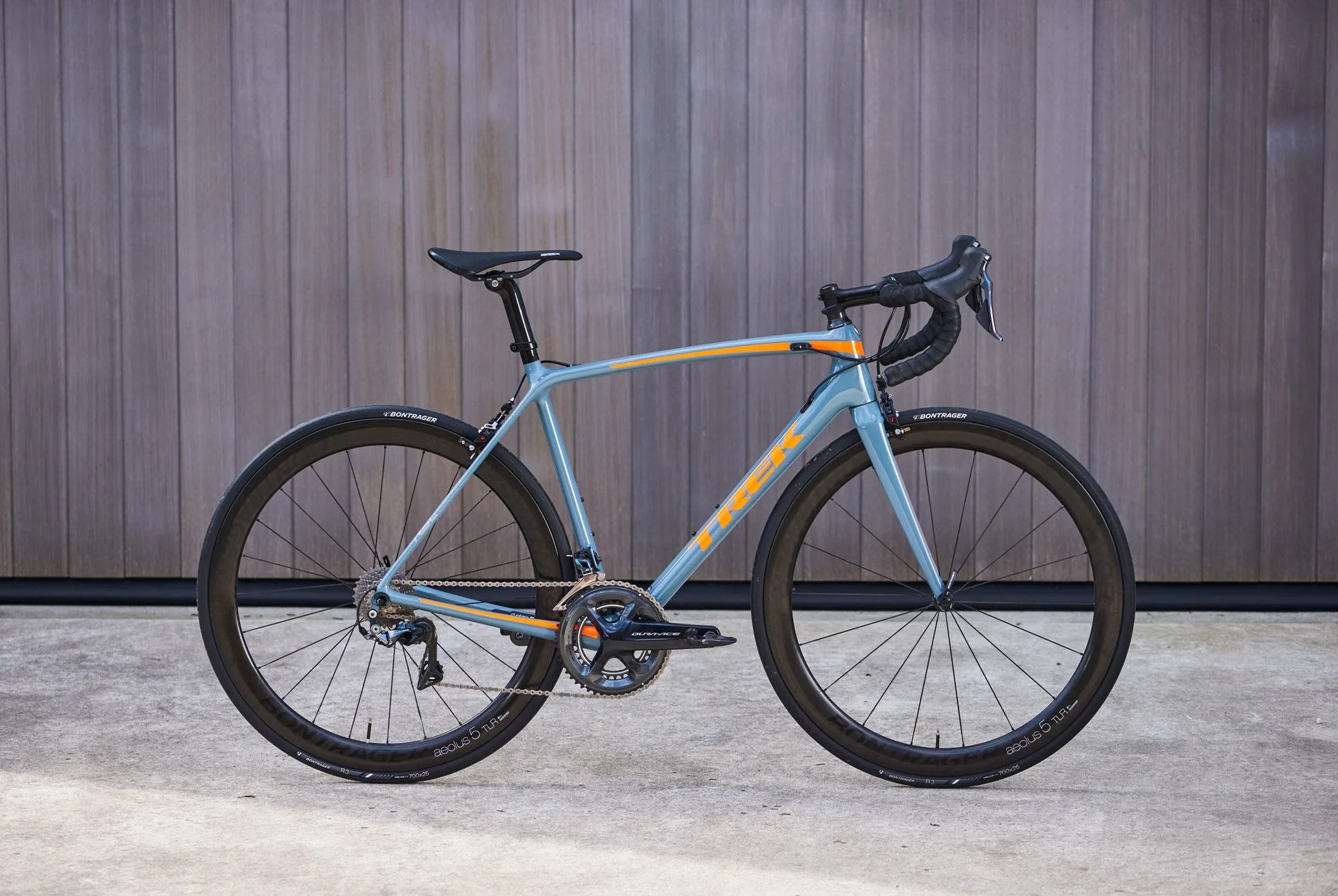Trek still makes all of its Project One carbon road frames in Waterloo, Wisconsin. The Émonda is the lightest production road line the company has ever made — a capable climber and a confident descender, comfortable enough to ride all day.