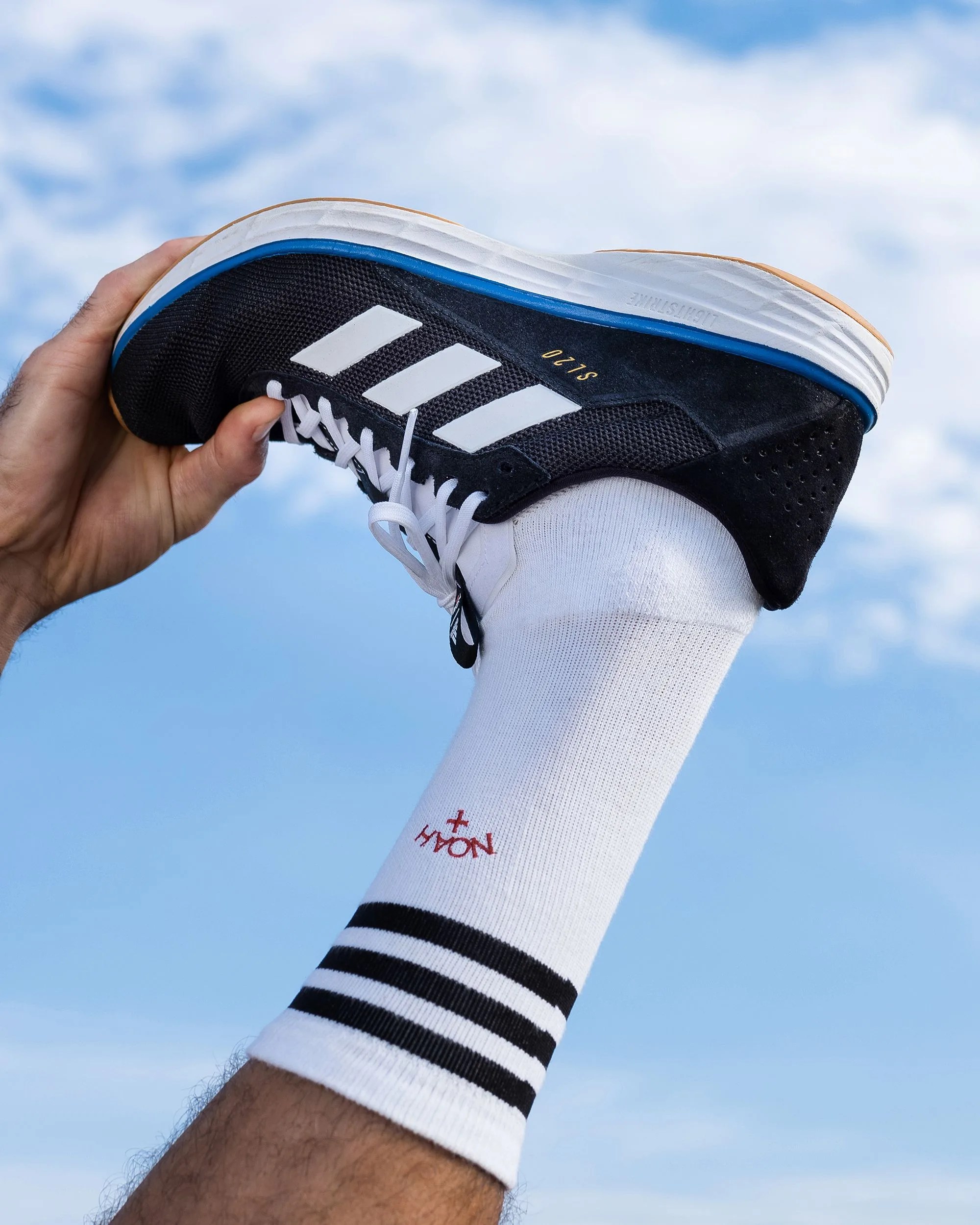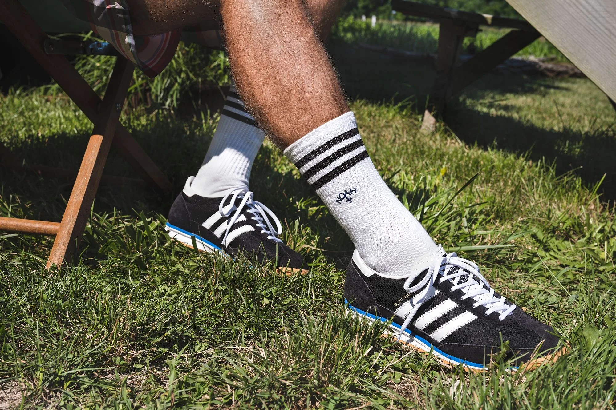 Now, Adidas has collaborated with NYC-based brand Noah to reimagine the iconic shoe. Noah explored the Adidas archive to drum up a vivid colorway with a vintage appeal (complete with Noah branding). But, perhaps the biggest change to the SL72 is the upper. It is made with 82 percent Prime Blue material, a performance material made using recycled material Parley ocean plastic. This upcycles plastic waste found on remote islands, beaches, coastal communities and shorelines. Noah’s passion for the ocean is clear, having also collaborated with brands like Birdwell Beach Britches as well as hosting events and raising money toward preserving the ocean. The SL72 builds that passion into the design process.