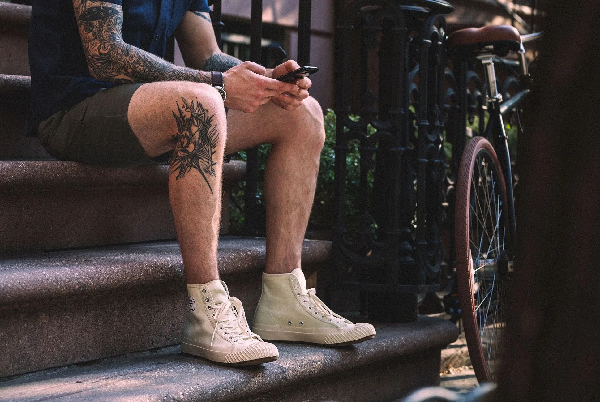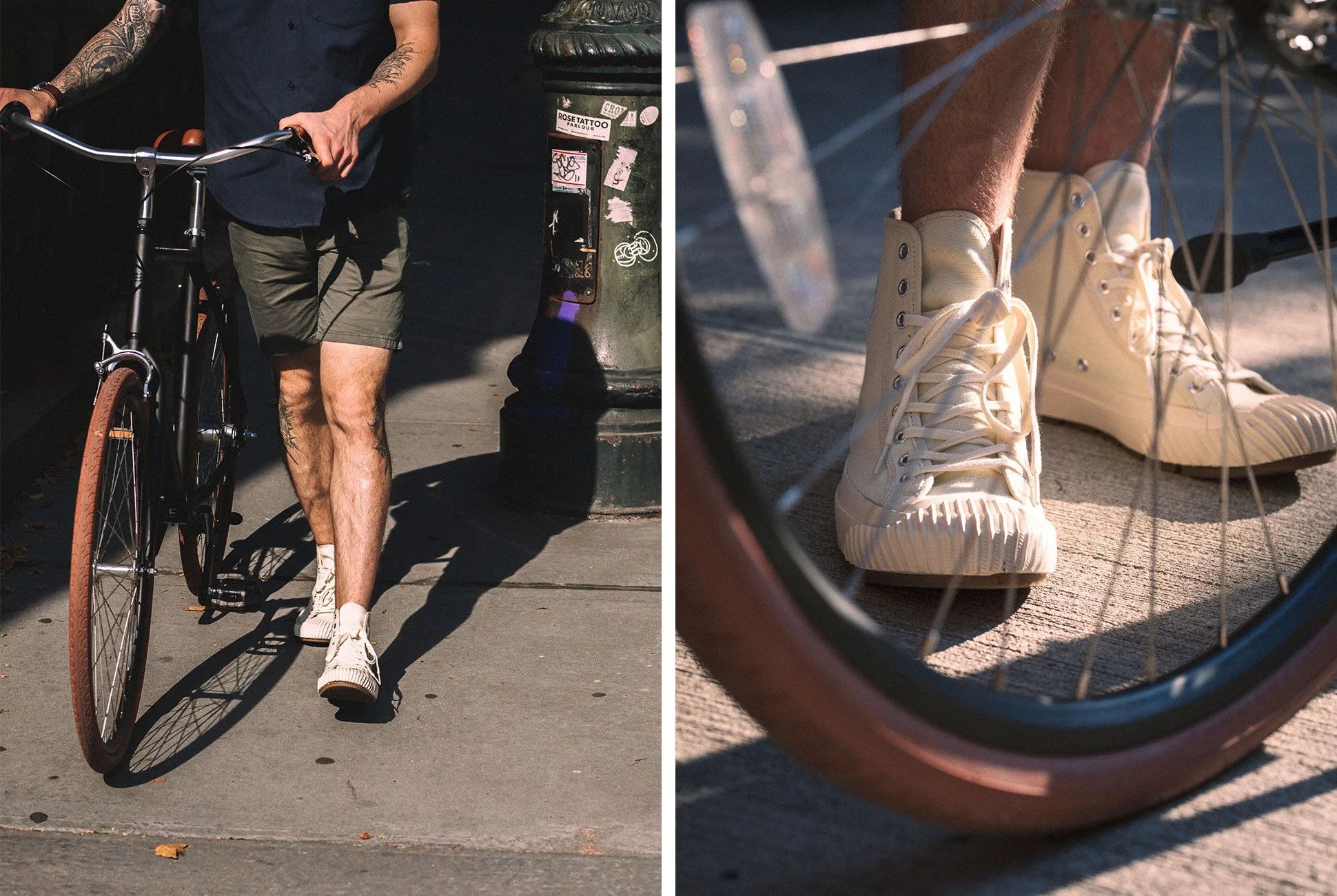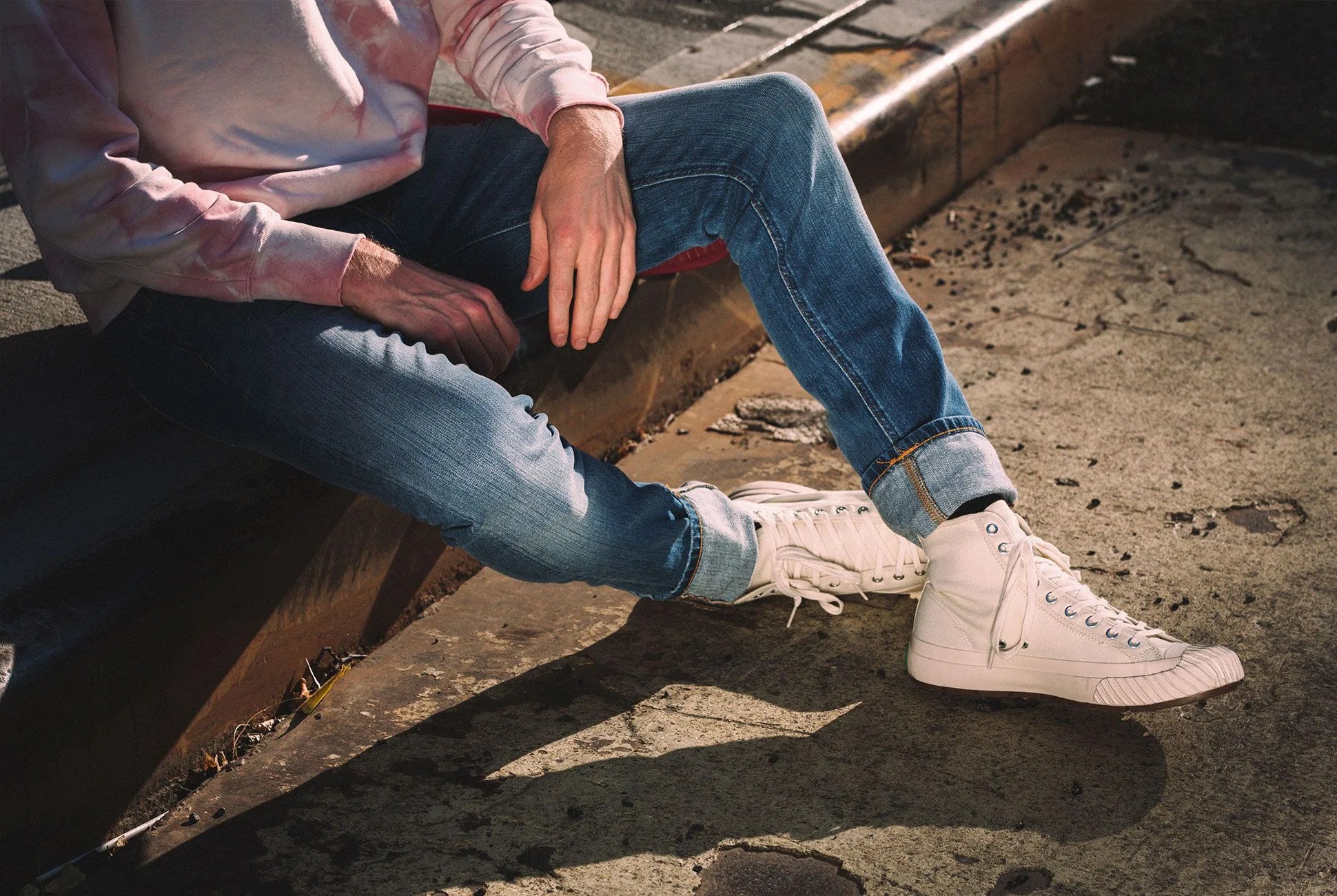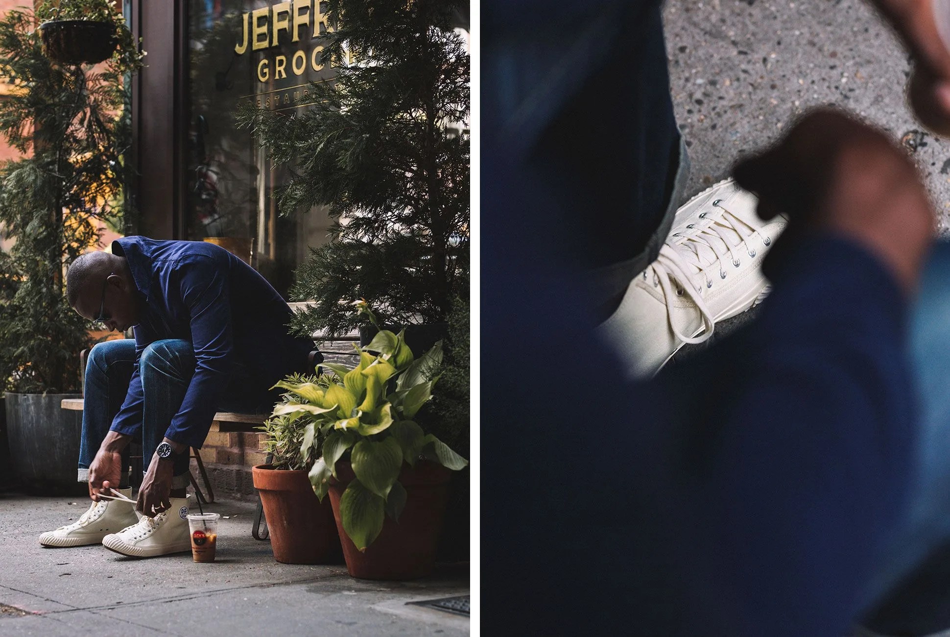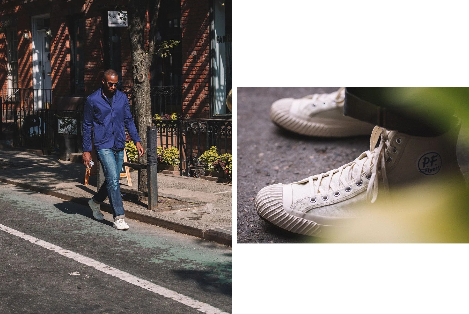 Canvas sneakers are essential warm-weather footwear, and for good reason. The minimal design is lightweight, breathable and durable. For decades, the same silhouettes have dominated the market, but recently PF Flyers offered an alternative style called the Grounder. Its design — a rugged sole and robust toe bumper, paired with a canvas high-top upper — originated in the archives of PF Flyers. After the Second World War, PF Flyers took the rubber lug sole from a shoe called the Wade Light and added it to their iconic canvas athletic high-top, the Center Hi. In production through the ‘60s, it was favored for outdoor pursuits and sports because of its heftier outsole.
