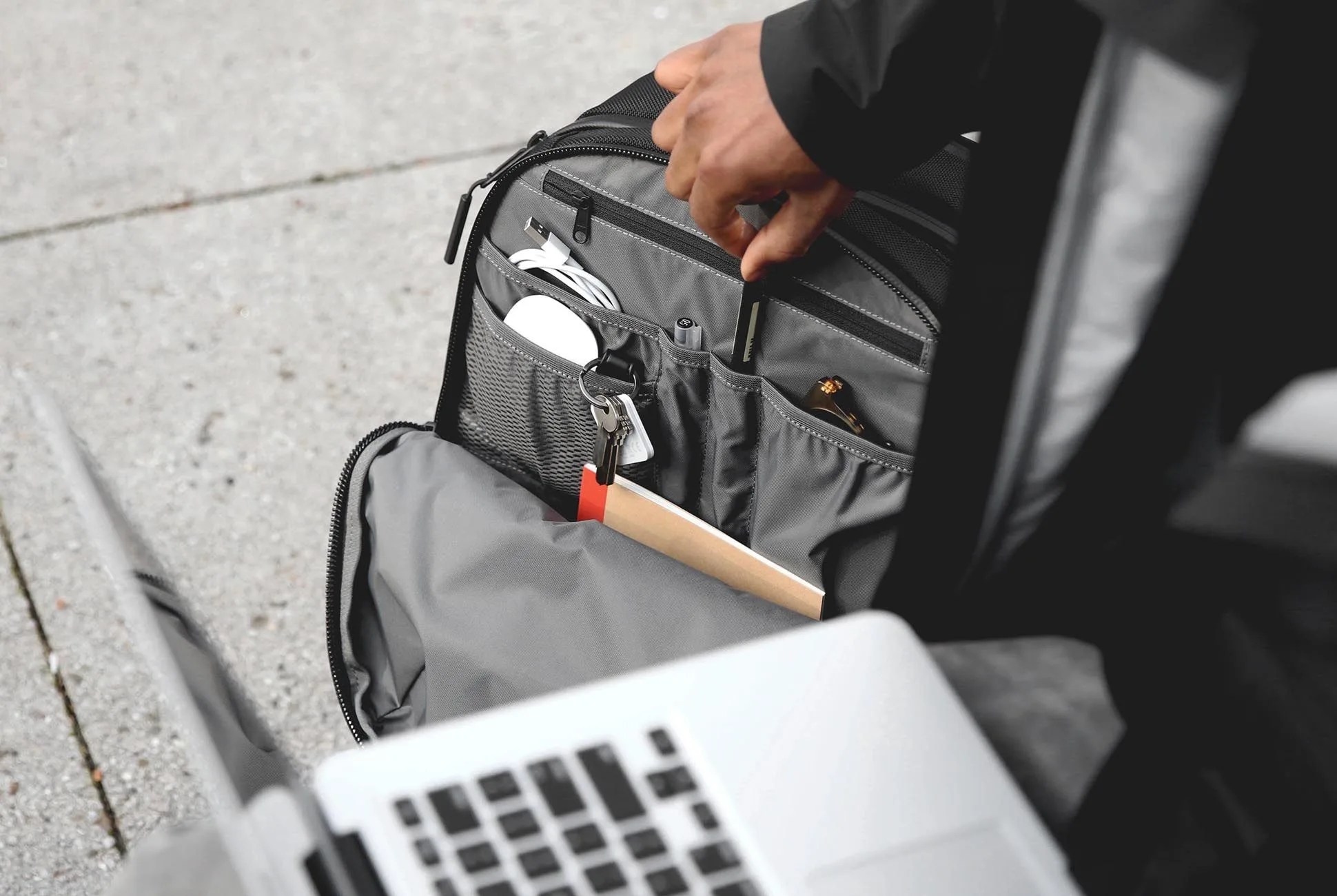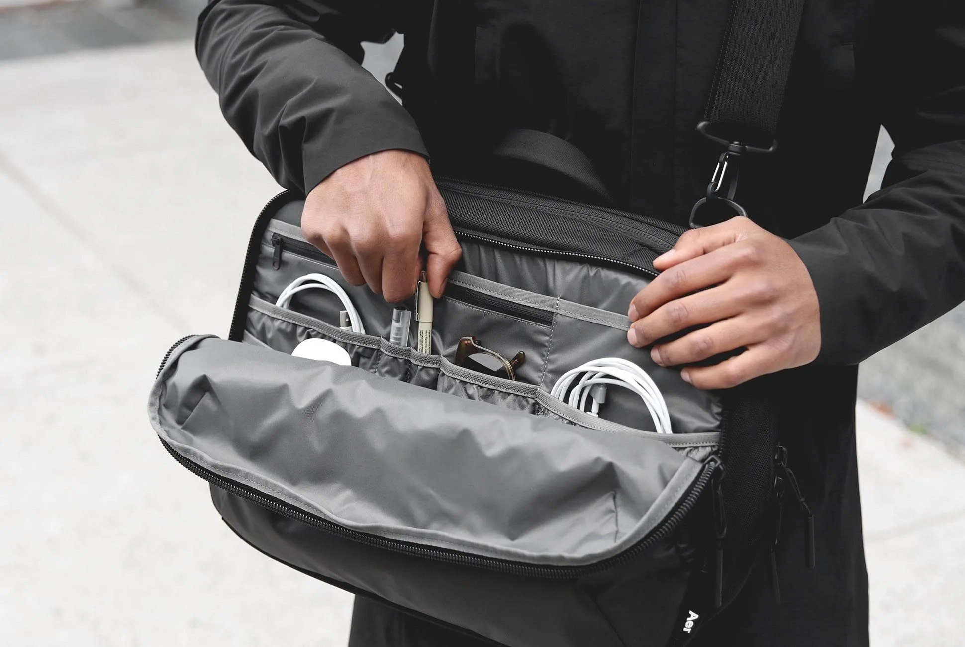Aer’s Work bags — a commuter, sling, cable kit and backpack — all employ water-resistant front lining, 1680D Cordura ballistic nylon sides, Duraflex plastic hardware (buckles, fasteners, etc.) and a clean, jet black aesthetic. They also offer a lifetime warranty should anything happen to your bag.