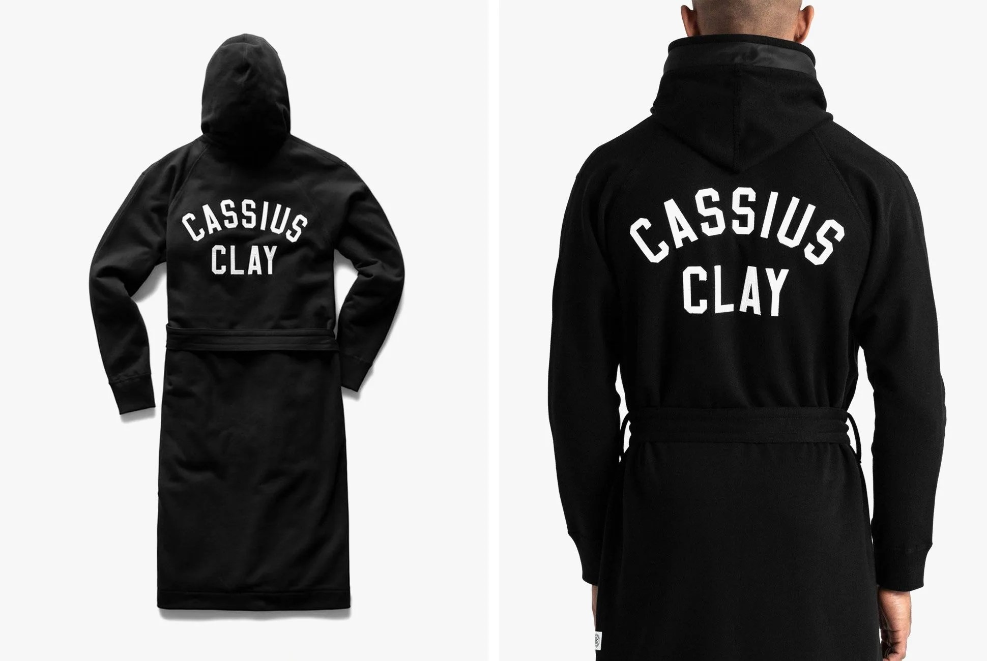 The items in this collection include a long satin-trimmed robe, an insulated satin bomber jacket, a boxing-inspired cutoff hoody, terrycloth shorts and a ring-spun tee shirt. For that special touch of significance, everything’s embroidered, patched, or printed with the date 02/25/64 — the date when Cassius Clay beat Sonny Liston and became Muhammad Ali.