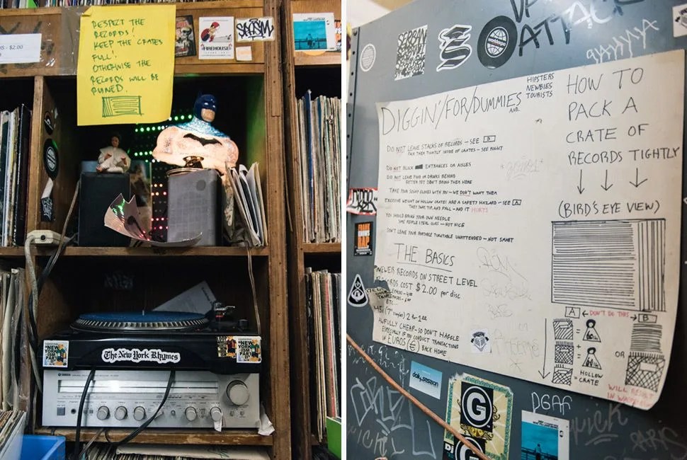 Taped to the dirty walls at The Thing record store in Greenpoint, Brooklyn are several signs with handwritten scrawls that warn of falling records. There’s the straightforward, penned-in-sharpie one that’s titled “Diggin for Dummies/Hipsters/Newbies/Tourists” (“Excessive weights on hollow crates are a safety hazard. They sway, tip, and fall.”). There’s the pleading one, also in sharpie, taped to a monstrous stack, crates encased in crates encased in crates so deep you could enclose a victim among them Cask of Amontillado-style: “Please don’t move these, you already had a chance at them but we need more space.” There’s the subtle one: little pieces of record shards scattered on the basement’s dirty concrete floor like so many sharp-edged leaves, their music forever sent to the Big Concert in the Sky by dummies/hipsters/newbies/tourists.