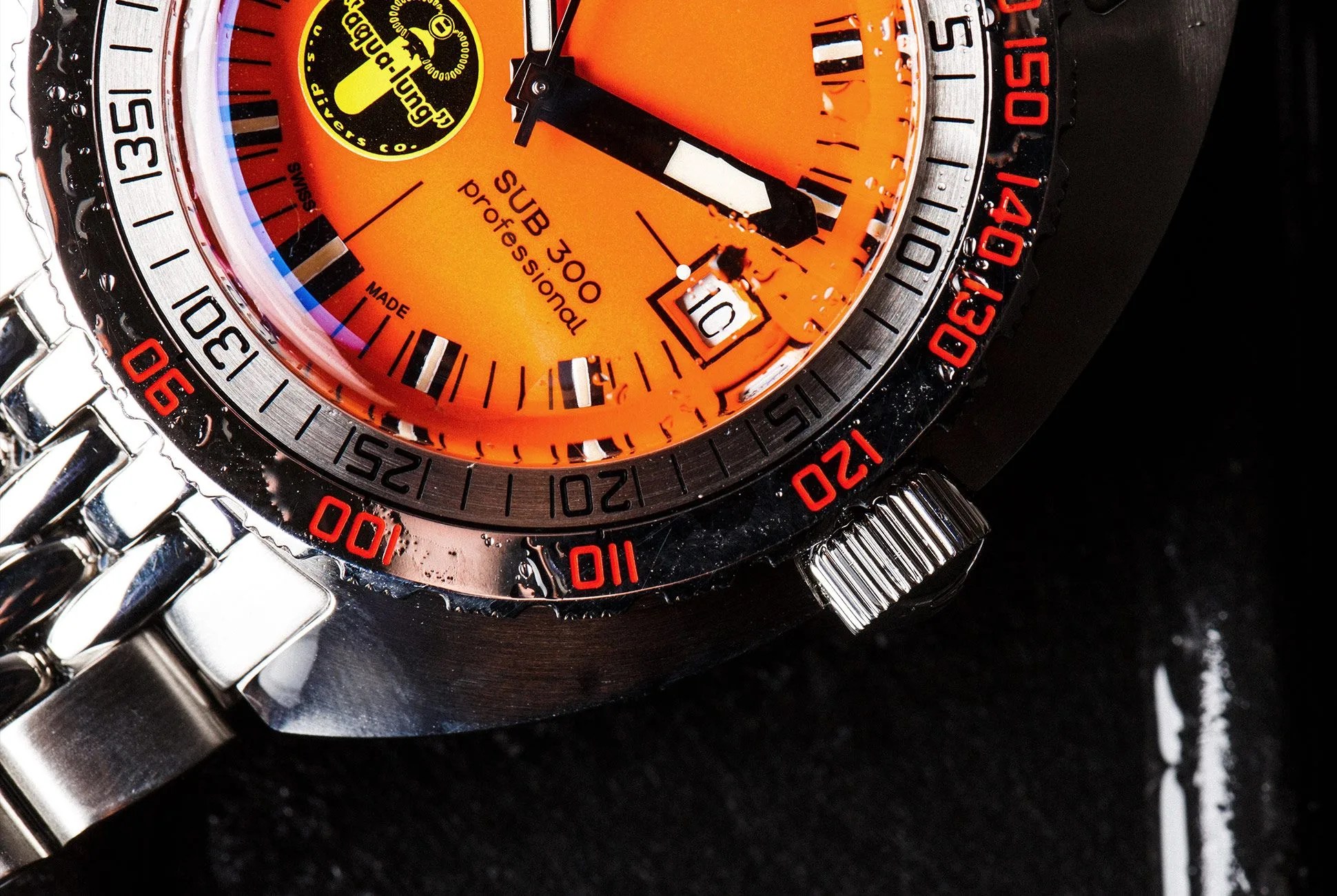 As a testament to the watch’s diving prowess, Cousteau — who had helped create the world’s first self-contained diving apparatus — distributed the watches under his company U.S. Divers (now consolidated into Aqua-Lung). As such, a handful of DOXA SUB 300 prototypes were made back in 1967 featuring a black and yellow U.S. Diver’s logo (featuring the wordmark “Aqualung”) at 8 o’clock, earning it the nickname “Black Lung.” Given its provenance and its rarity, it became elusive amongst collectors, but DOXA has just reissued the Black Lung as a modern variant.