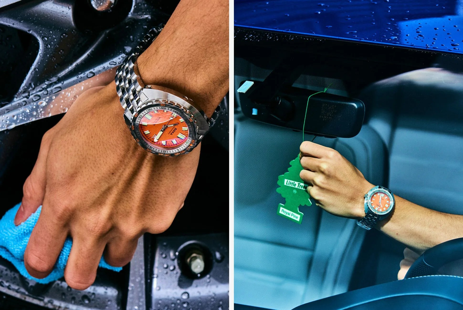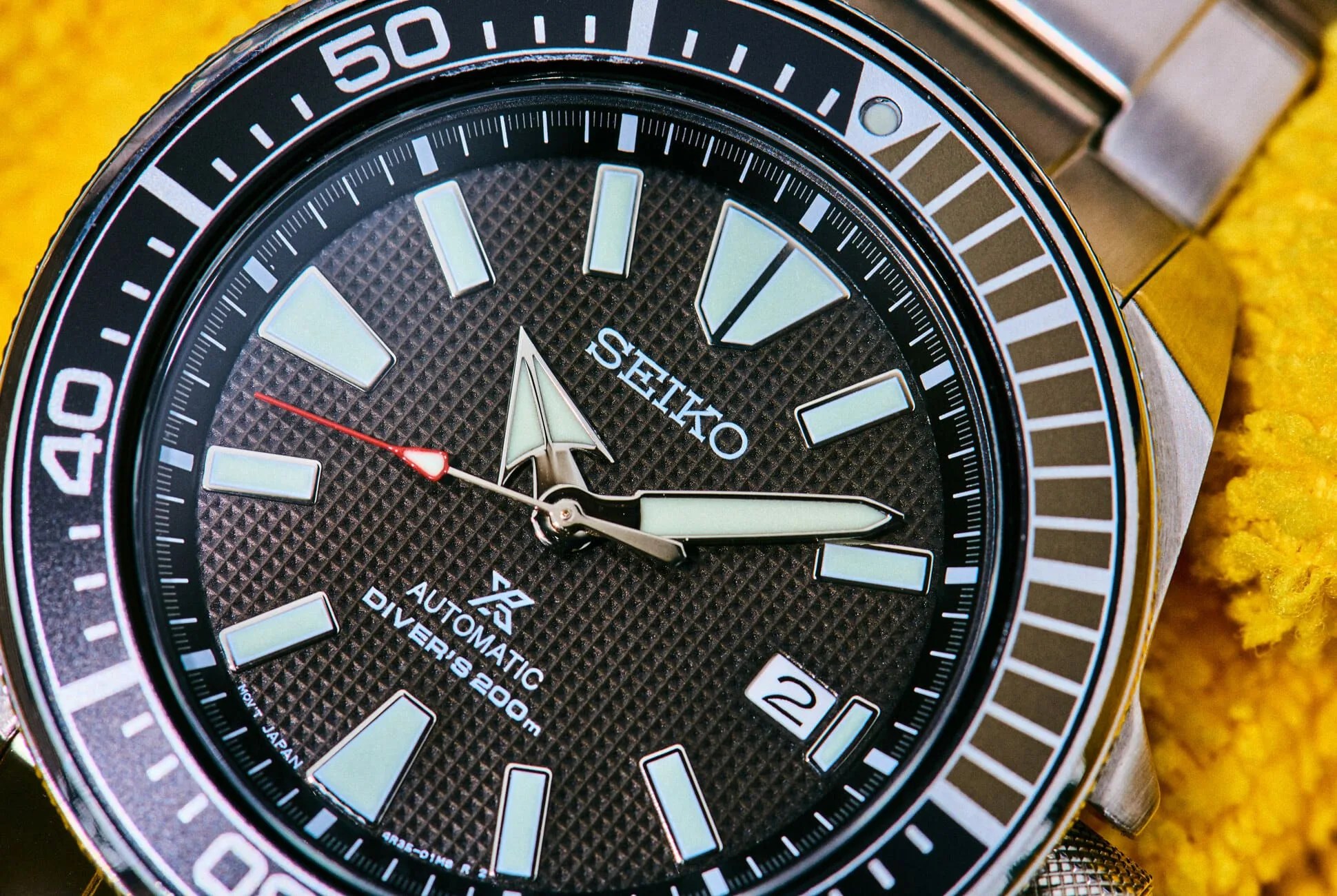 Seiko’s SKX and Sea Urchin divers are archetypal beater watches, but the brand’s ISO-compliant mechanical divers — like the Prospex — add so much more for a small investment. The crisp, sculpted and brushed stainless steel case design on this Samurai (a throwback to cult-favorite Seiko diver from the 2000s) is indicative of that, as are the textured dial and the in-house automatic movement inside.