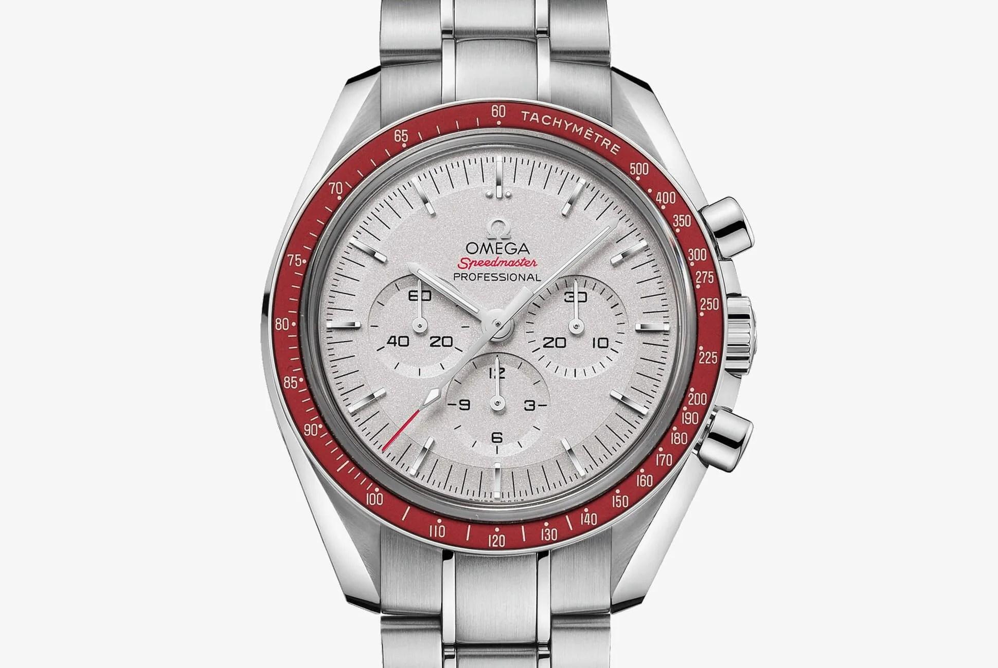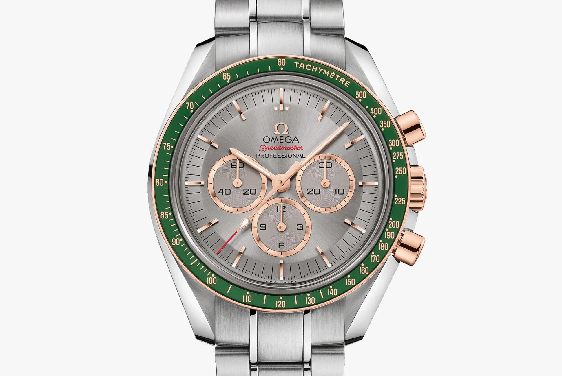 Based on the venerable Speedmaster Professional, the limited edition maintains many of the specs and features watch enthusiasts are familiar with: a 42mm case, Omega’s Caliber 1861 hand-winding chronograph, and a tachymeter bezel, to name a few. The differences come in the form of five colorways inspired by the hues of the five Olympic rings: there’s a blue-and-white dial variant, a gold-trimmed version representing yellow, a panda dial representing black, a reference with a green tachymeter bezel and a red bezel version as well.