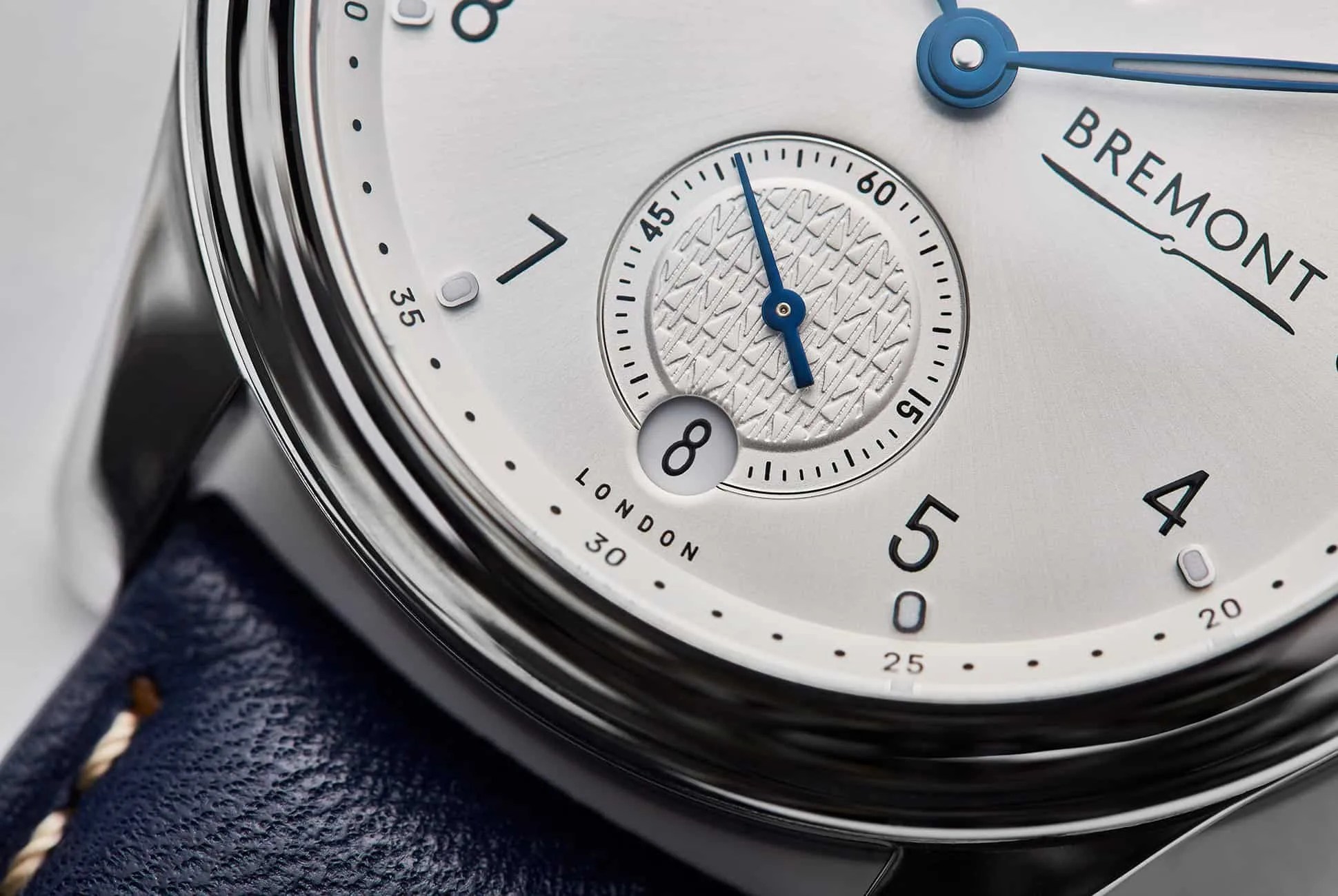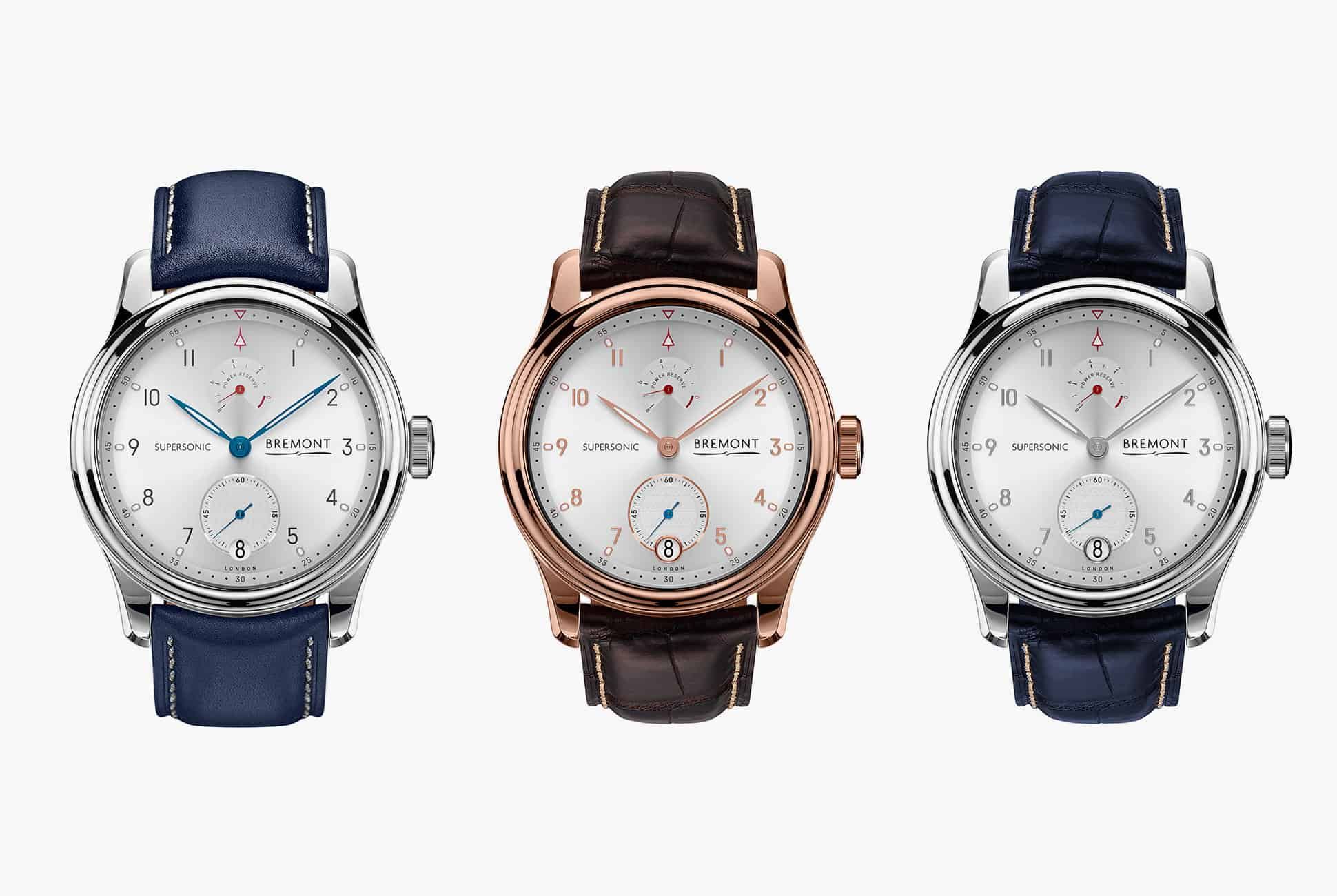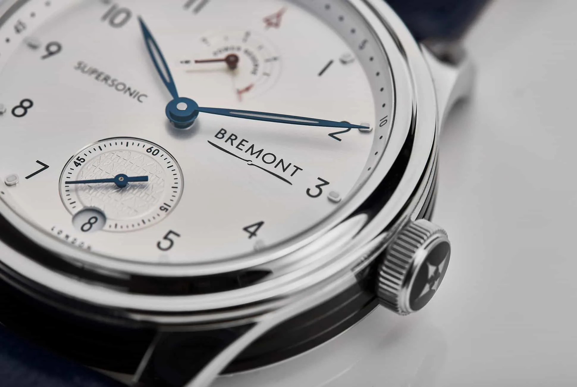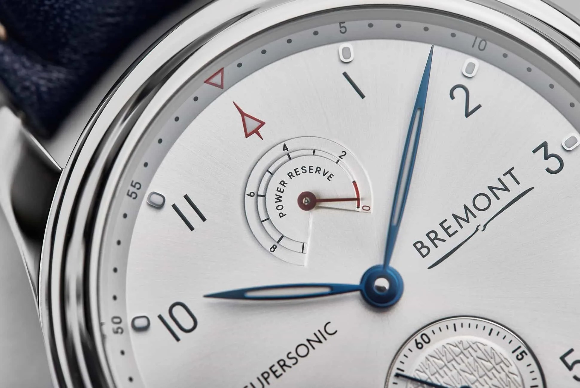 The watch itself features Bremont’s first-ever manual-wind movement with 8-day power reserve, a sunburst white dial reminiscent of the Concorde’s reflective paint, sword hands, power reserve indicator, sub-seconds dial, date window at 6 o’clock and the brand’s signature 43mm Trip-Tich case with 22mm lug width. The Supersonic is water-resistant to 100 meters and ships on a leather strap in Corcorde blue, blue crocodile, or brown alligator.